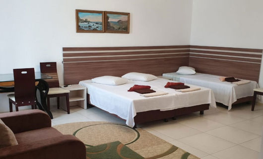В номерах есть все необходимые атрибуты для комфортного отдыха: кондиционер, горячая и холодная вода круглосуточно и без перебоев, Wi-Fi, холодильник, сейф для ценных вещей, спутниковое ТВ, набор посуды и даже фен с утюгом. Тщательная профессиональная уборка в номерах проводится ежедневно.