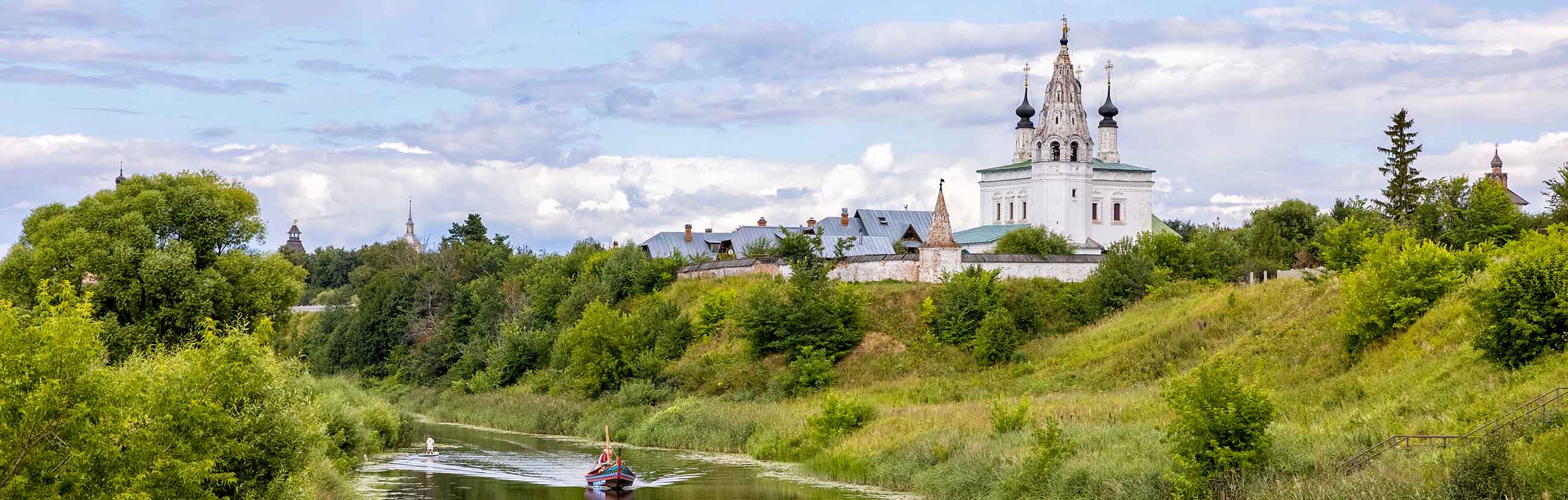 Чем так привлекает этот городок? Прежде всего, колоритом. Вы окажетесь в русской глубинке, хотя от Москвы всего ничего — около 200 километров. Пейзажи тут — загляденье, особенно летом. Белокаменные стены и храмы на фоне зеленой листвы. Сверкающие купола. Речка, будто узкая голубая лента. Суздаль не раз превращался в съемочную площадку. Тут снимали «Женитьбу Бальзаминова», «Чародеев», «Сказ про Федота-стрельца» и другие фильмы.