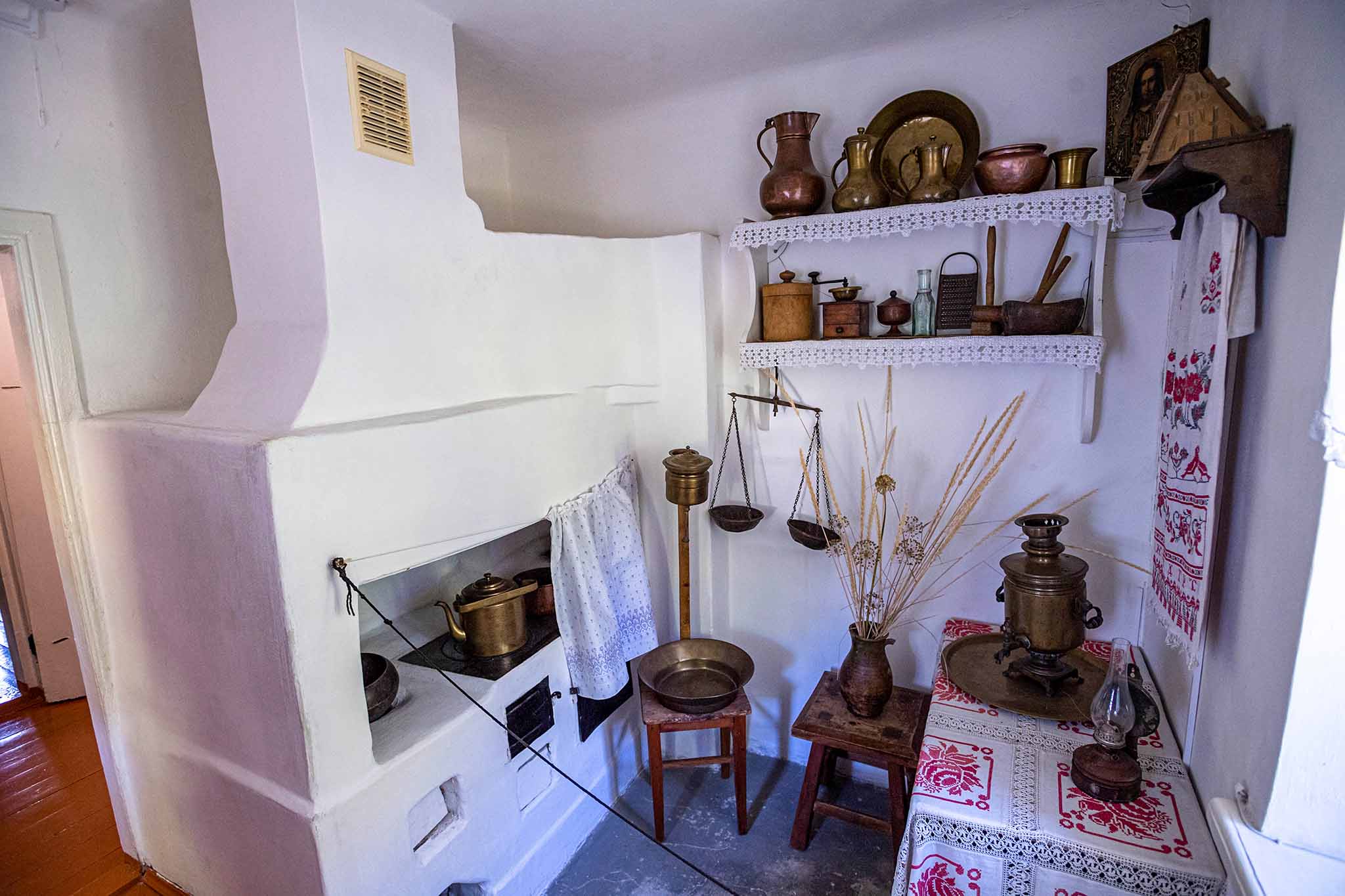 В небольшой кухне сохранился глинобитный пол и печь, которая служила для приготовления пищи и обогрева дома. Помимо русской деревянной посуды, здесь можно увидеть латунную и медную, которая в середине XIX века была доступна в крупном портовом городе на Азовском море.