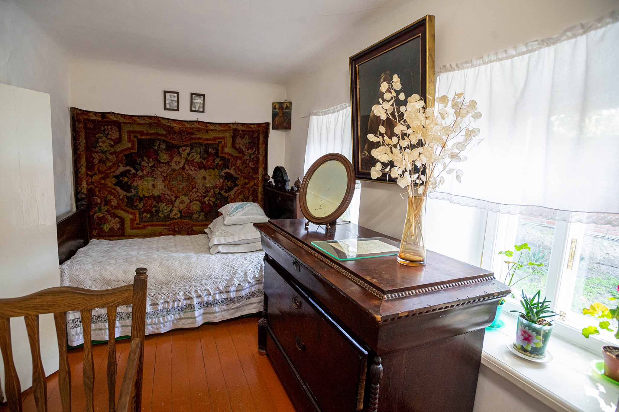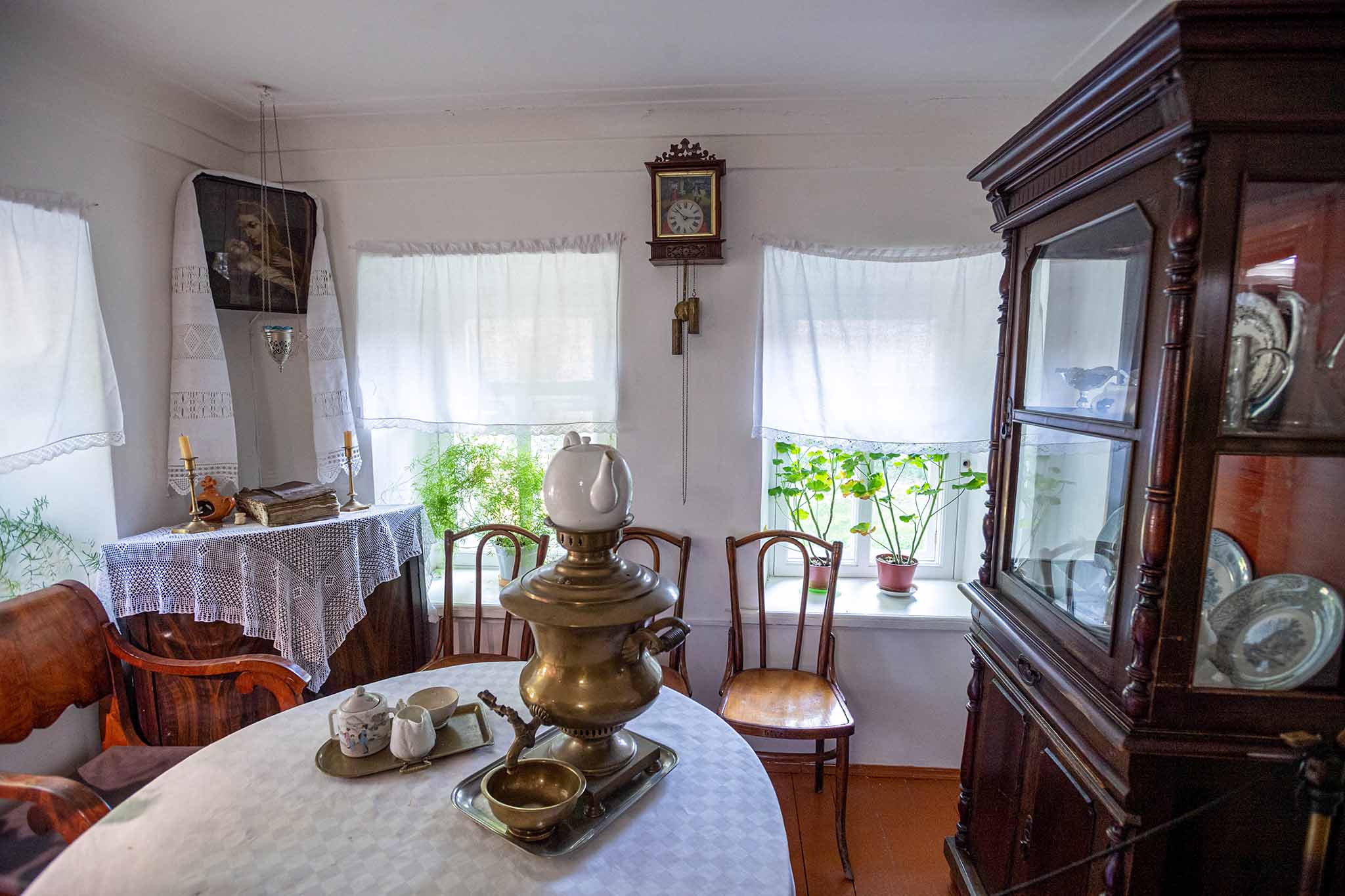 В домике стоит сфотографировать обстановку комнат, запечатлеть множество ажурных белоснежных салфеток, занавесок и скатертей, вязаных крючком. Снимите флигель от входа в усадьбу — отсюда он виден утопающим в зелени или цветущих вишневых деревья.