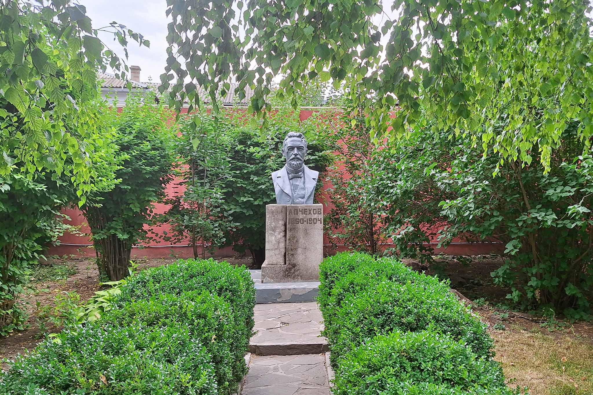 У входа в усадьбу, возле ведущей к флигелю аллеи, установлен памятник Антону Чехову. Его автор — таганрогский скульптор Вера Морозова. В течение двух лет она работала над бюстом драматурга.