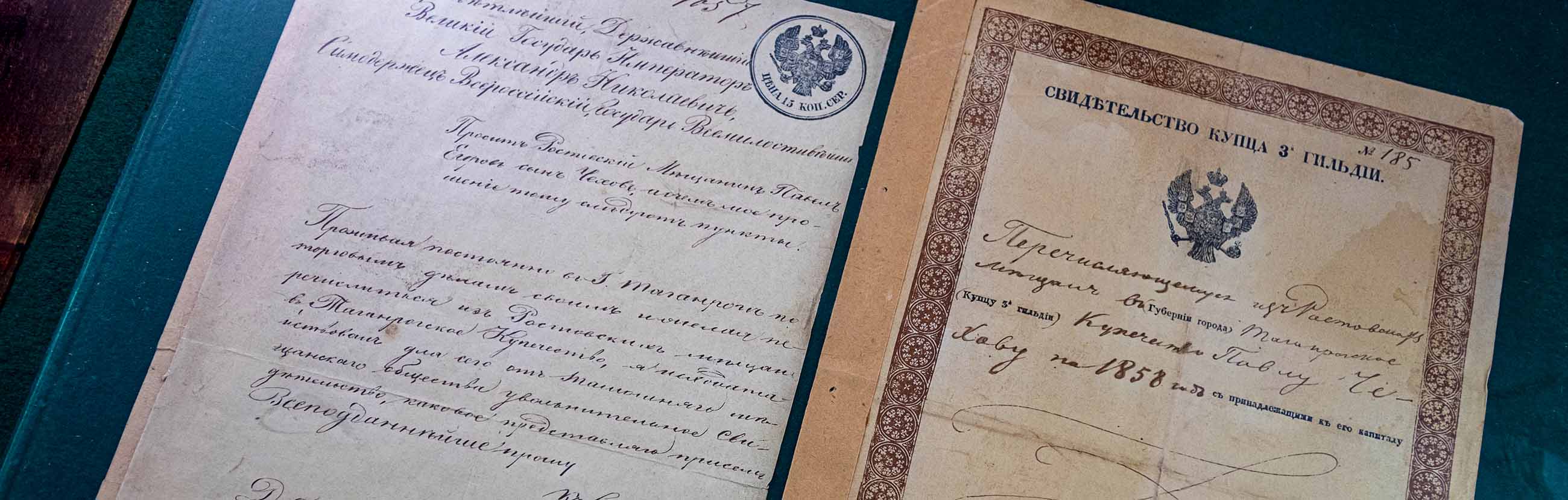На столе — посуда Чеховых, в горке можно увидеть пивную кружку и графин, которые принадлежали непосредственно Антону Павловичу. В красном углу висит икона «Пресвятая Богородица с младенцем», написанная двоюродным дедом писателя Василием Чеховым. На стене — фотография старшего поколения семьи, а на конторке под стеклом — прошение Павла Чехова о причислении его к таганрогскому купечеству и свидетельство купца третьей гильдии, полученное в 1858 году.
