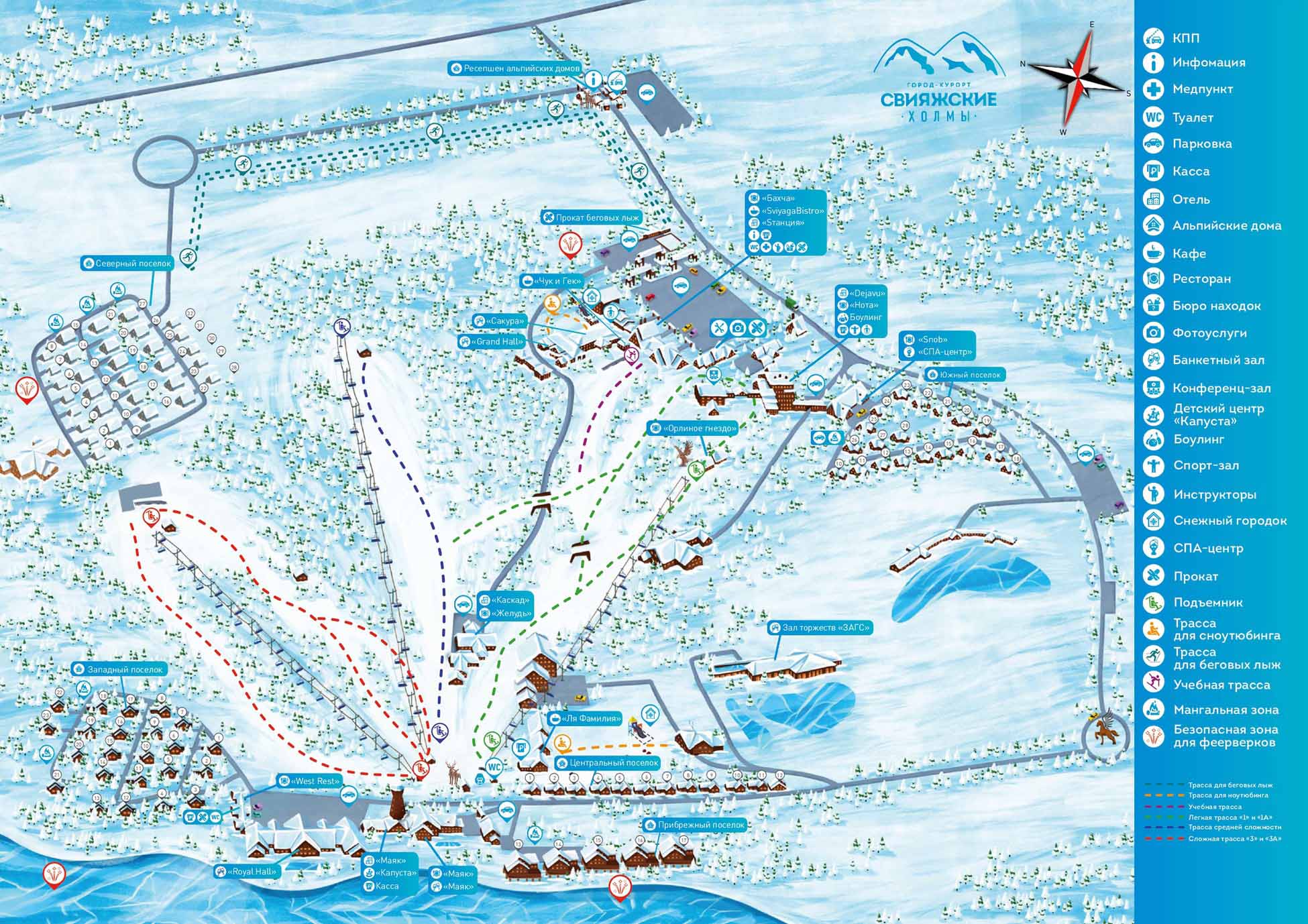 Свияжские холмы в Татарстане – центр отдыха, не уступающий по инфраструктуре и сервису европейским курортам. Здесь гармонично вписанные в ландшафт домики по праву называются альпийскими. Протяженность горнолыжных трасс совсем небольшая, но эта особенность рельефа достойно компенсируется массой развлечений и высоким уровнем обслуживания.