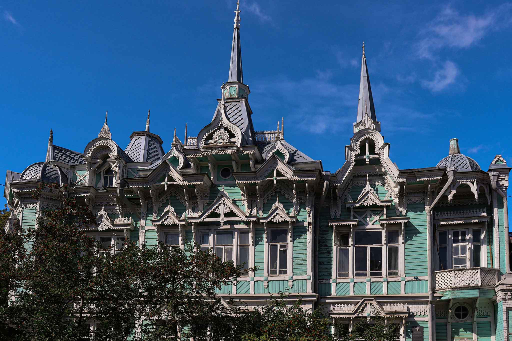 Восхитительный терем был построен в 1904 году губернским зодчим Станиславом Хомичем для своей большой семьи. Архитектору удалось органично соединить модный в те времена модерн и сказочную ропетовщину. Оказалось, что огромный дом накладно отапливать, поэтому часть помещений сразу же стали сдавать внаем. Сейчас томский памятник архитектуры занимает Росздравнадзор по Томской области.