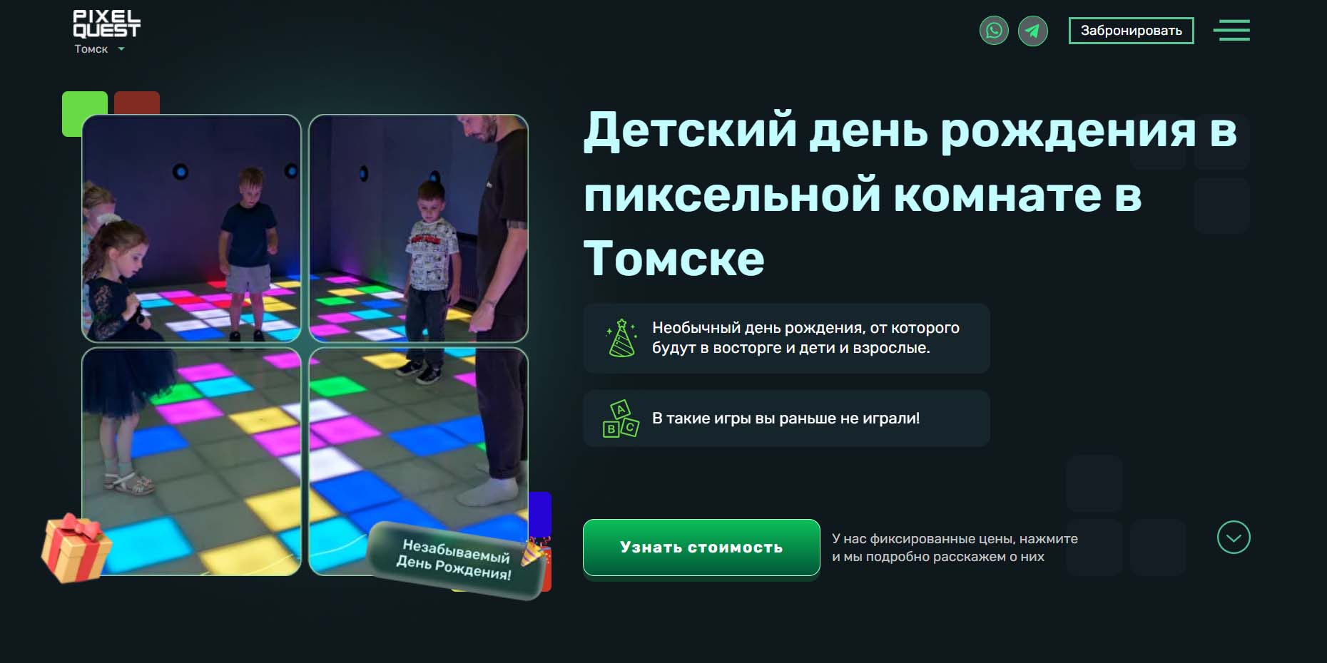 Пространство представляет из себя просторную комнату со световым полом, который может превратиться в лаву, море, горы или таинственный лабиринт — всего есть более 50 игровых сценариев на разный возраст. Можно собраться небольшой компанией, а можно привести до 20 гостей и разбить их на команды. Сделать праздник увлекательным и интересным поможет профессиональный аниматор, который подскажет, как и во что лучше играть. Приходить можно со своей едой и напитками.