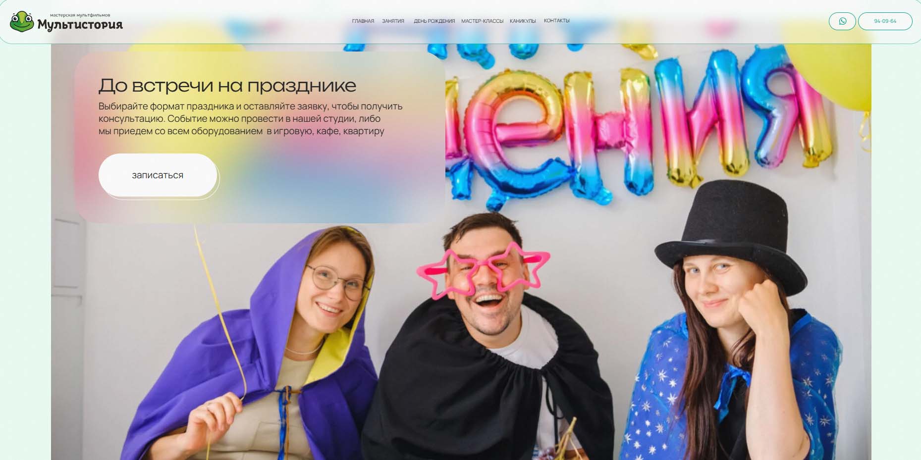 Мастерская мультфильмов — место для творческого праздника. Здесь дети не просто играют, а вместе создают мультфильм, который останется на память о дне рождения. Программа выстроена так, что именинник оказывается в центре внимания. Гости могут выбрать более спокойный формат «Мульт-праздник» или более активный «Мульт-квест». В любом случае итогом станет готовый мультфильм. Конечно же, праздник не обойдется без угощения.