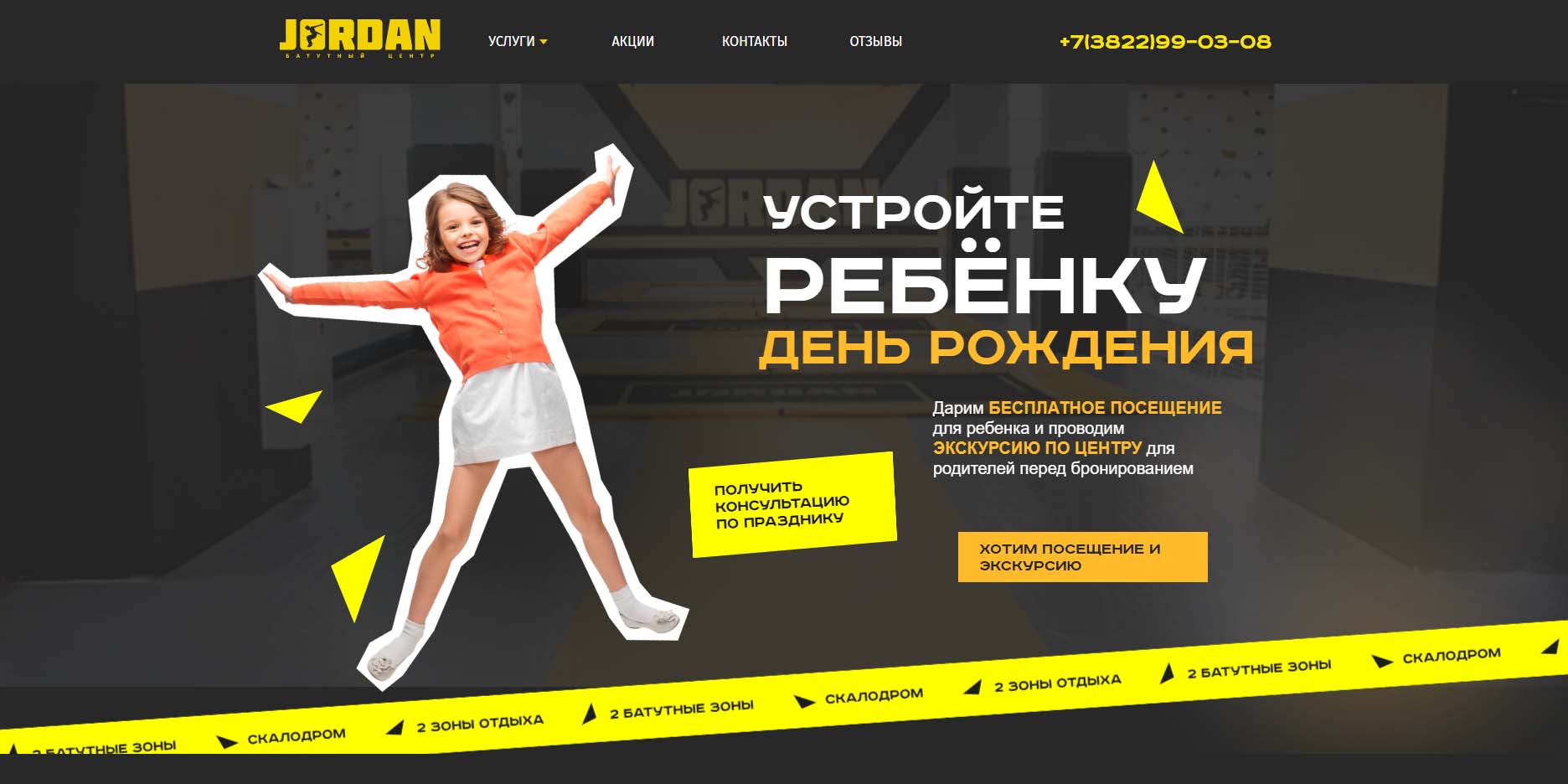 В этом центре 27 батутов, игровой зал, скалодром и две комнаты отдыха. Для гостей есть несколько видов праздничных программ — как спортивно-развлекательных, так и тематических, познавательных и творческих. Кроме разнообразных прыжков и покорения скалодрома, ребята участвуют в квестах, сражаются на нерф-арене и участвуют в мастер-классах. Перед бронированием можно побывать на бесплатной экскурсии.