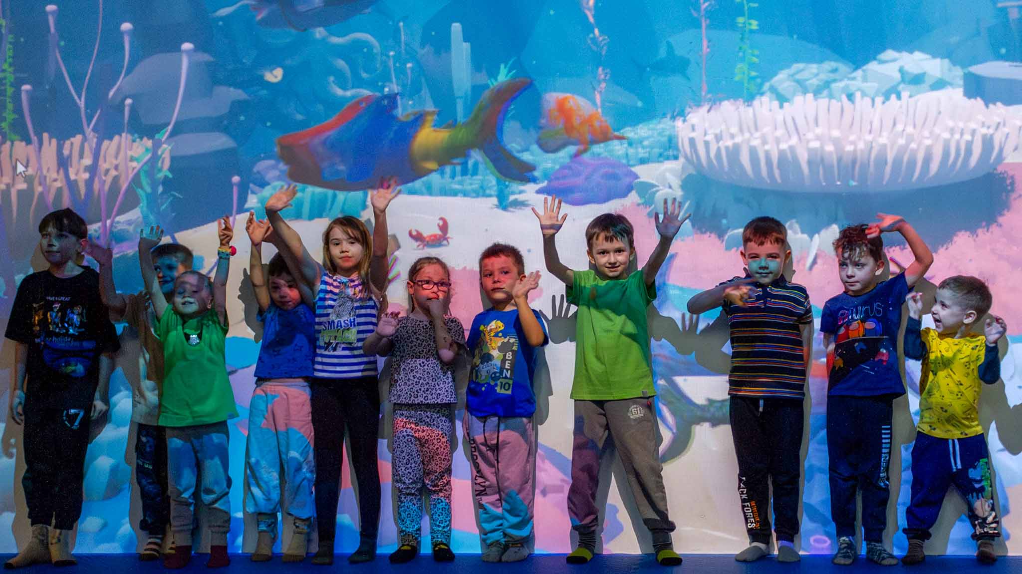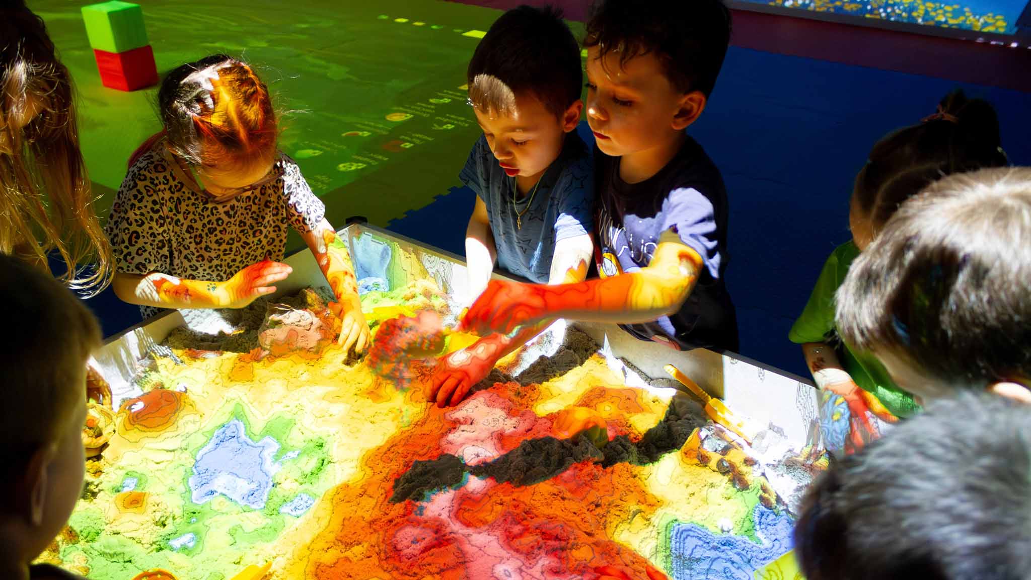 Игровой центр предлагает различные интерактивные развлечения. Персонажи, которых дети рисуют на бумаге, оживают на огромном настенном экране, а на Песочном острове можно создавать целые миры — вулканы, моря и города, которые под волшебным светом кажутся настоящими.