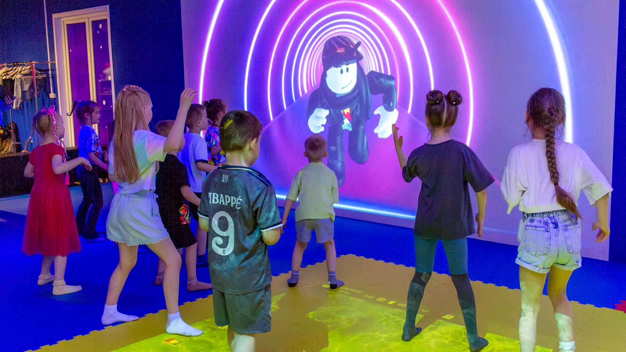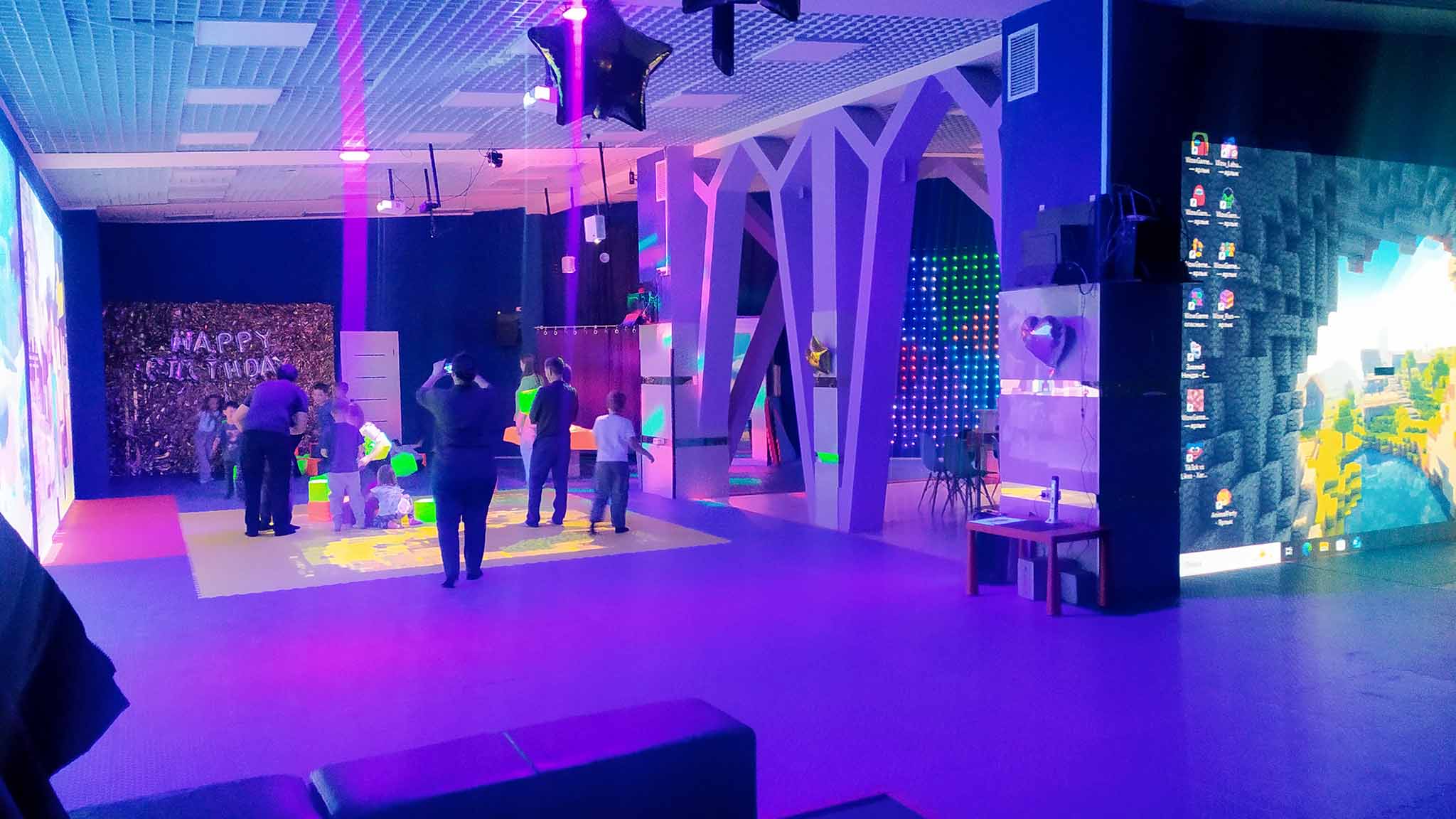 Пространство представляет из себя просторную комнату со световым полом, который может превратиться в лаву, море, горы или таинственный лабиринт — всего есть более 50 игровых сценариев на разный возраст. Можно собраться небольшой компанией, а можно привести до 20 гостей и разбить их на команды. Сделать праздник увлекательным и интересным поможет профессиональный аниматор, который подскажет, как и во что лучше играть. Приходить можно со своей едой и напитками.
