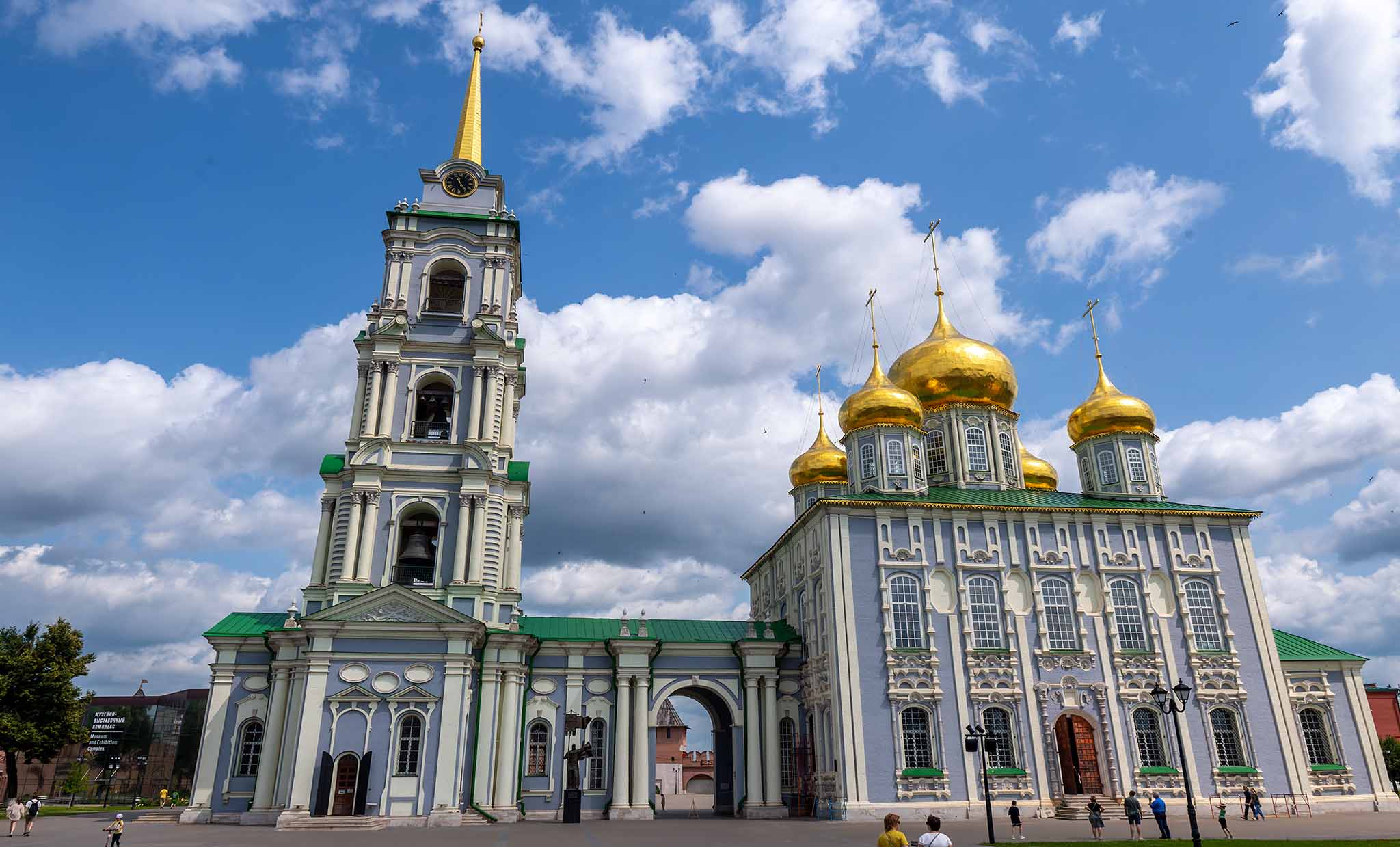 Главная достопримечательность и старейшее сооружение Тулы. Кремль был возведен в XVI веке. События в истории Кремля тесно связаны с ключевыми моментами в стране, такими как вторжение крымских войск, восхождение на престол Лжедмитрия I и восстание под руководством Ивана Болотникова. В отличие от большинства крепостей, Тульский кремль был построен не на возвышенности, а в низком, болотистом месте — в пойме реки Упы. С середины XVII века он утратил свое первоначальное значение, а в 1988 году на его территории был создан музей. В состав архитектурного ансамбля Кремля входят не только древние стены и башни, но и Успенский собор (XVIII в.) с уникальными фресками ярославских мастеров, соборная колокольня, восстановленная в 2013–2014 годах, Богоявленский собор (XIX в.), а также торговые ряды. В 2017 году был открыт Музейно-выставочный комплекс. Четыре зала посвящены военной истории, народному искусству, истории кремля, а также тульскому прянику и самовару.