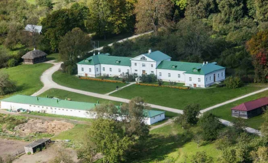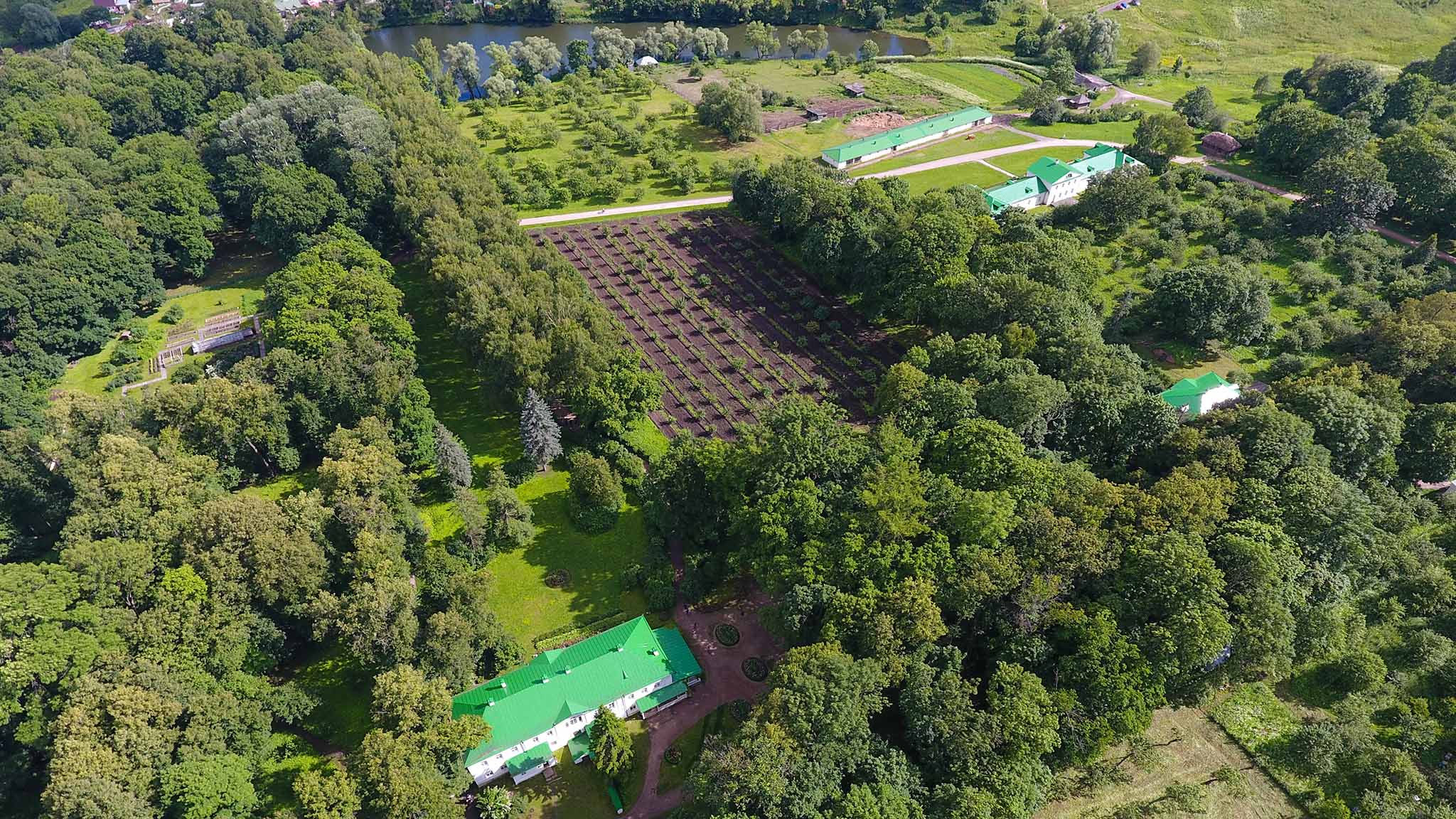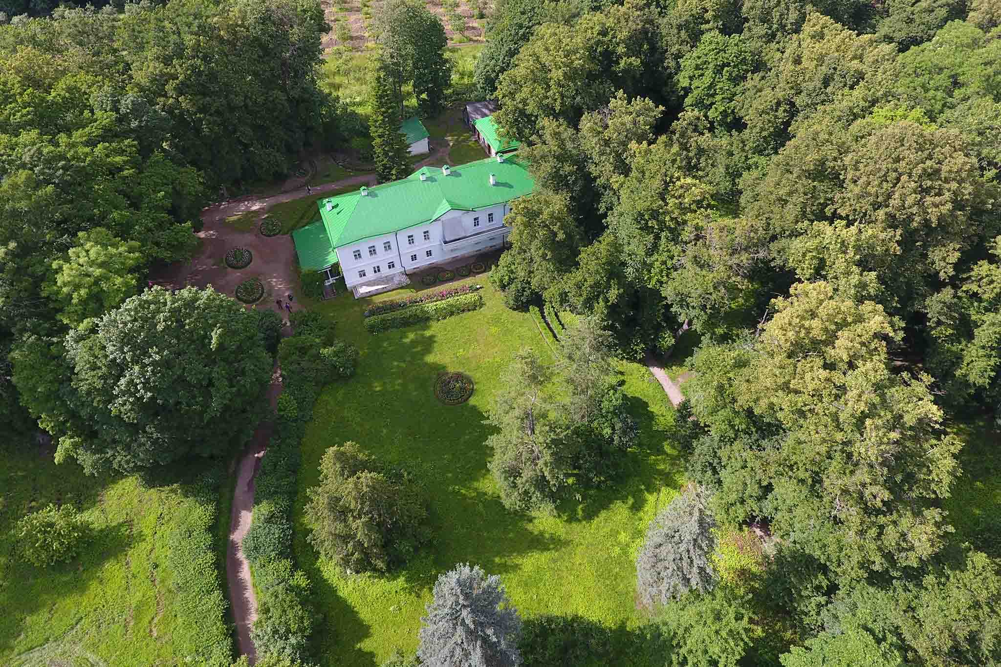 При входе в усадьбу посетителей встречают две башни. Когда-то они служили опорой для больших железных ворот. От башенок к дому писателя ведет березовая аллея, которую до сих пор называют першпектом. В самом ее начале находится Большой пруд, а справа — Нижний парк.