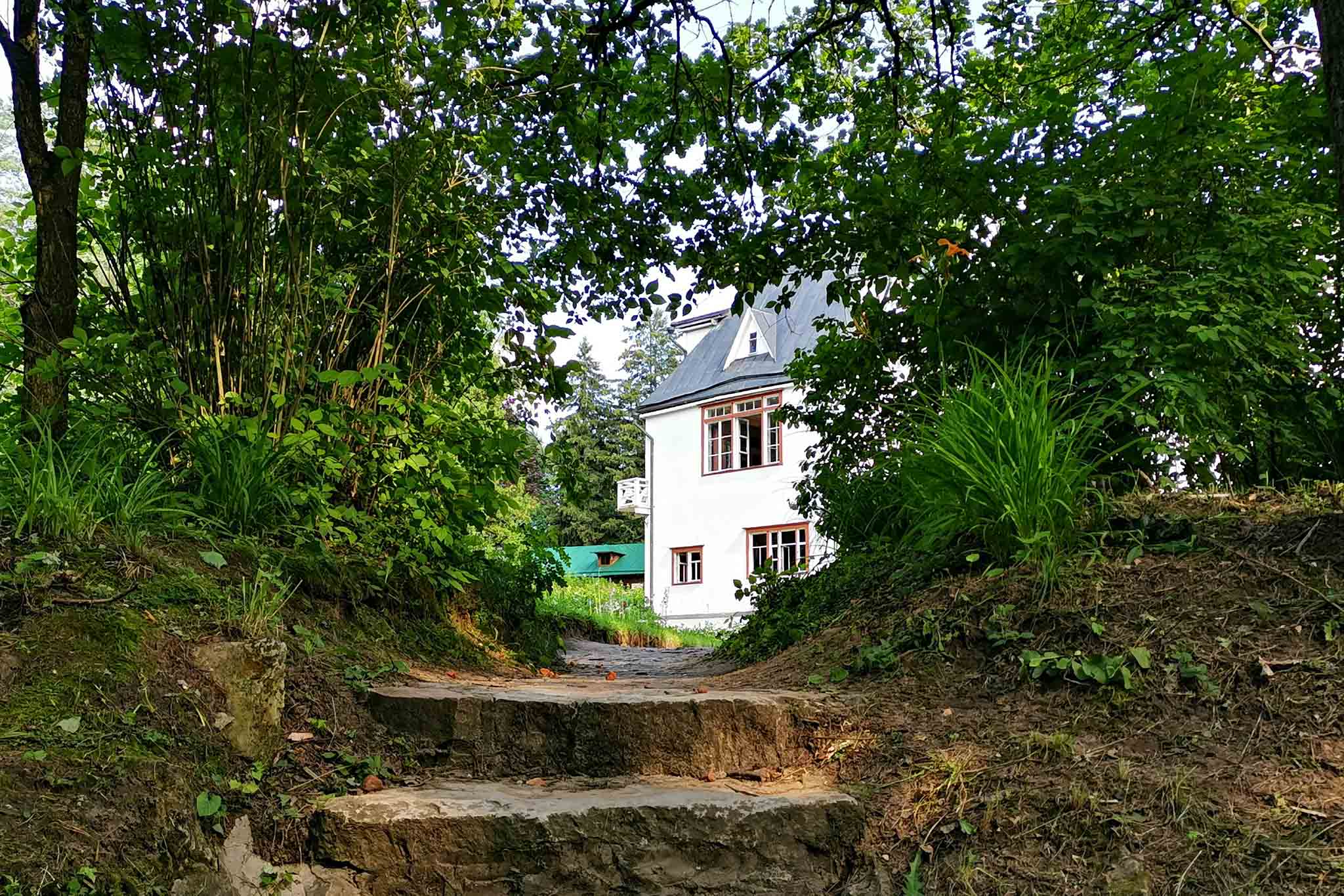 Во всем чувствуется, что строился этот дом для комфортной жизни большой семьи и, конечно, работы. Заметны внимание к деталям и необычные решения: асимметрия фасадов, различные формы окон, необычные балконы. Большой дом за столь долгое время сохранился без изменений: крепкое трехэтажное деревянное здание с белыми оштукатуренными стенами.