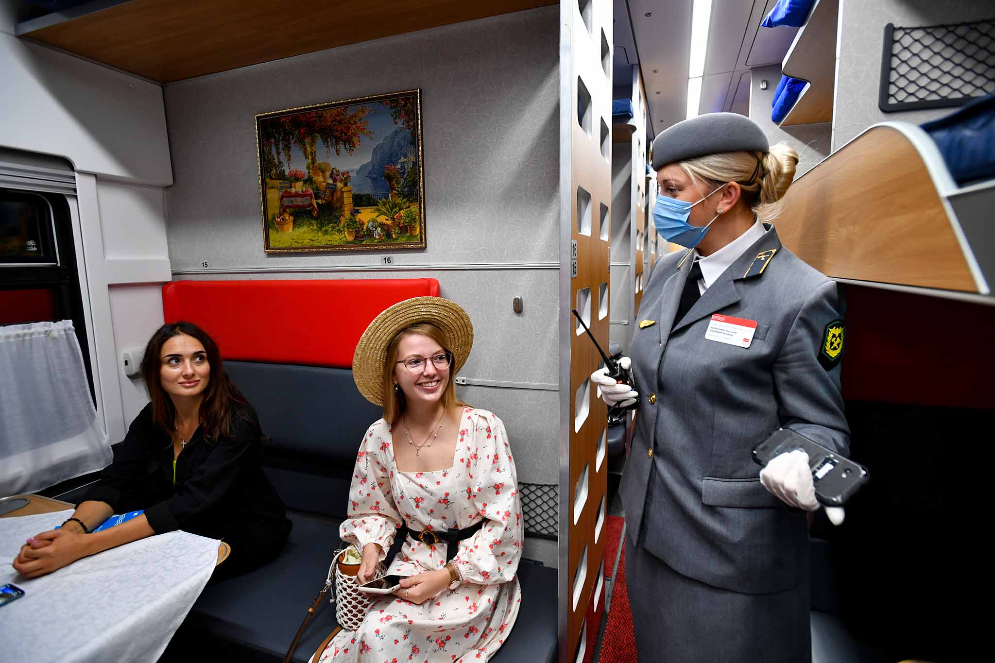 В состав включены вагоны почти всех существующих категорий. Не хватает только класса «Люкс», но нужен ли он в столь короткой поездке? Самые бюджетные билеты в вагоны «Сидячий» и «Общий». В обоих сидячие места, но разный уровень комфортабельности. Есть плацкарты и купе. Для тех, кто хочет даже короткое путешествие провести уединенно, есть СВ — «спальный вагон».