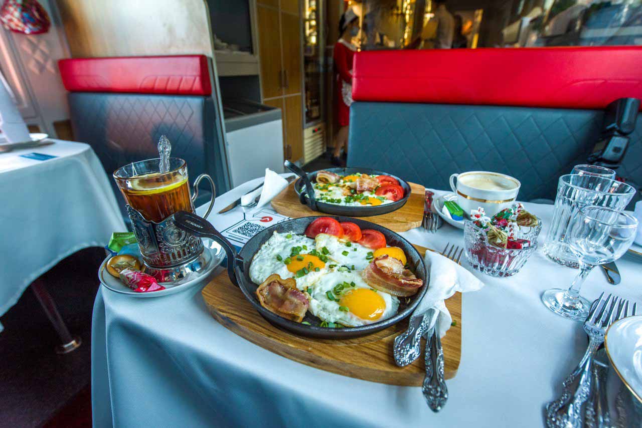 Вагоны туристического поезда оформлены в ретростиле. На крючках висят плетеные авоськи с продуктовыми сувенирами, стены украшены плакатами и натюрмортами. В вагоне-ресторане столы сервируют в «советском стиле»: салфетки, сложенные в граненый стакан, аккуратная вазочка с цветами на каждом столе. По стилю все очень похоже на эпоху фильма «Бриллиантовая рука» — его ведь снимали в Гаграх, куда и следует поезд. При этом сам состав — из современных вагонов. Есть кондиционеры, биотуалеты, розетки, USB-порты для подзарядки гаджетов.