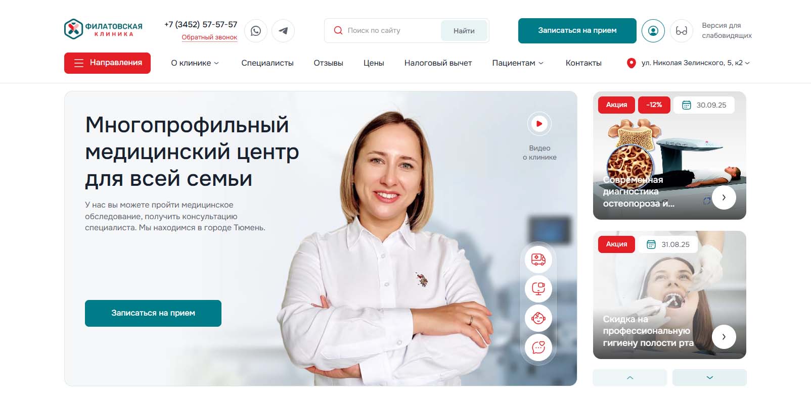 В многопрофильной клинике лечат детей и взрослых семь дней в неделю. Здесь есть возможность получить комплекс диагностических, лечебных, профилактических и реабилитационных услуг. От приема у врача-терапевта до дневного стационара. Есть процедурный кабинет, собственная лаборатория и отделение восстановительного лечения, где есть возможность провести физиотерапию, механотерапию и кинезиотерапию. Работают в Тюмени больше 14 лет, в штате порядка 300 специалистов.