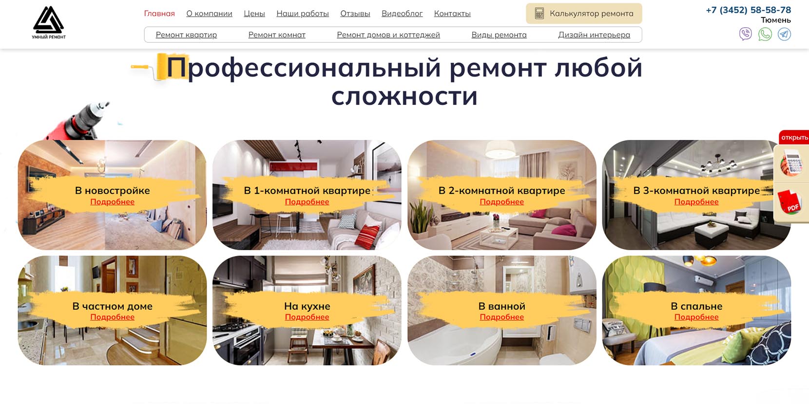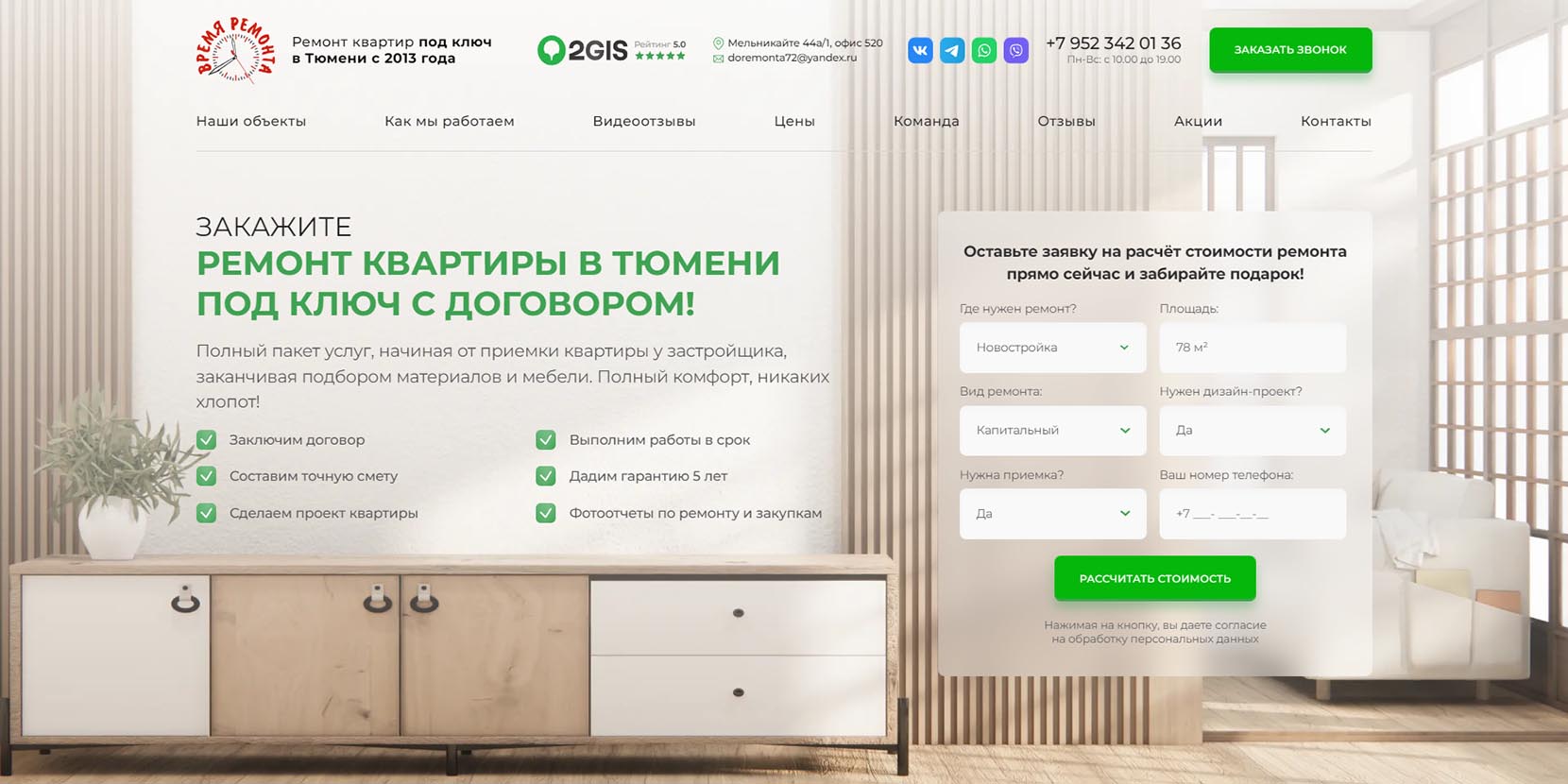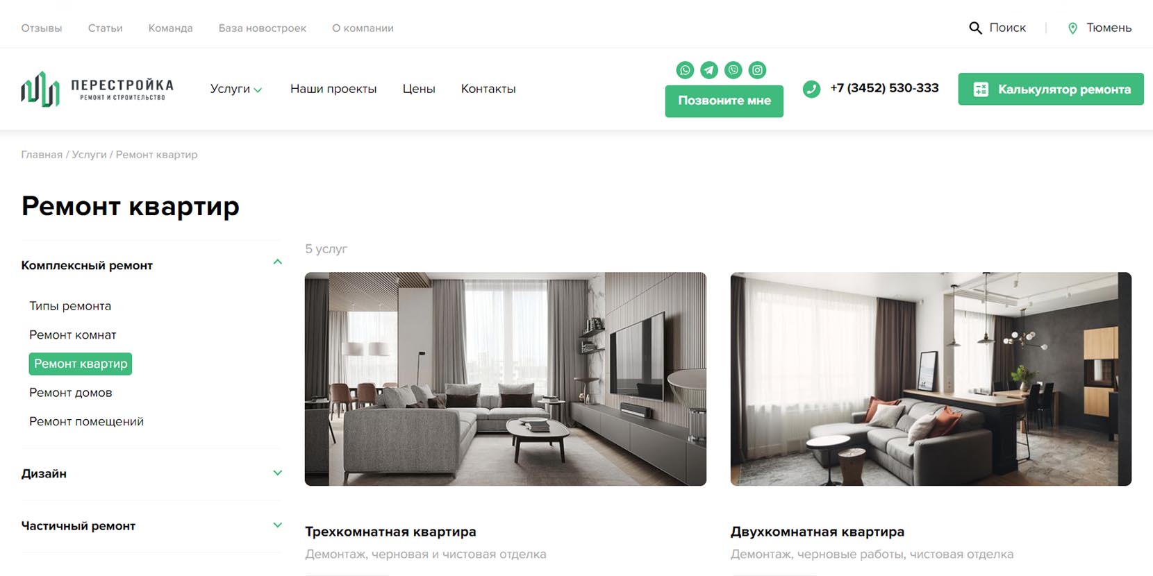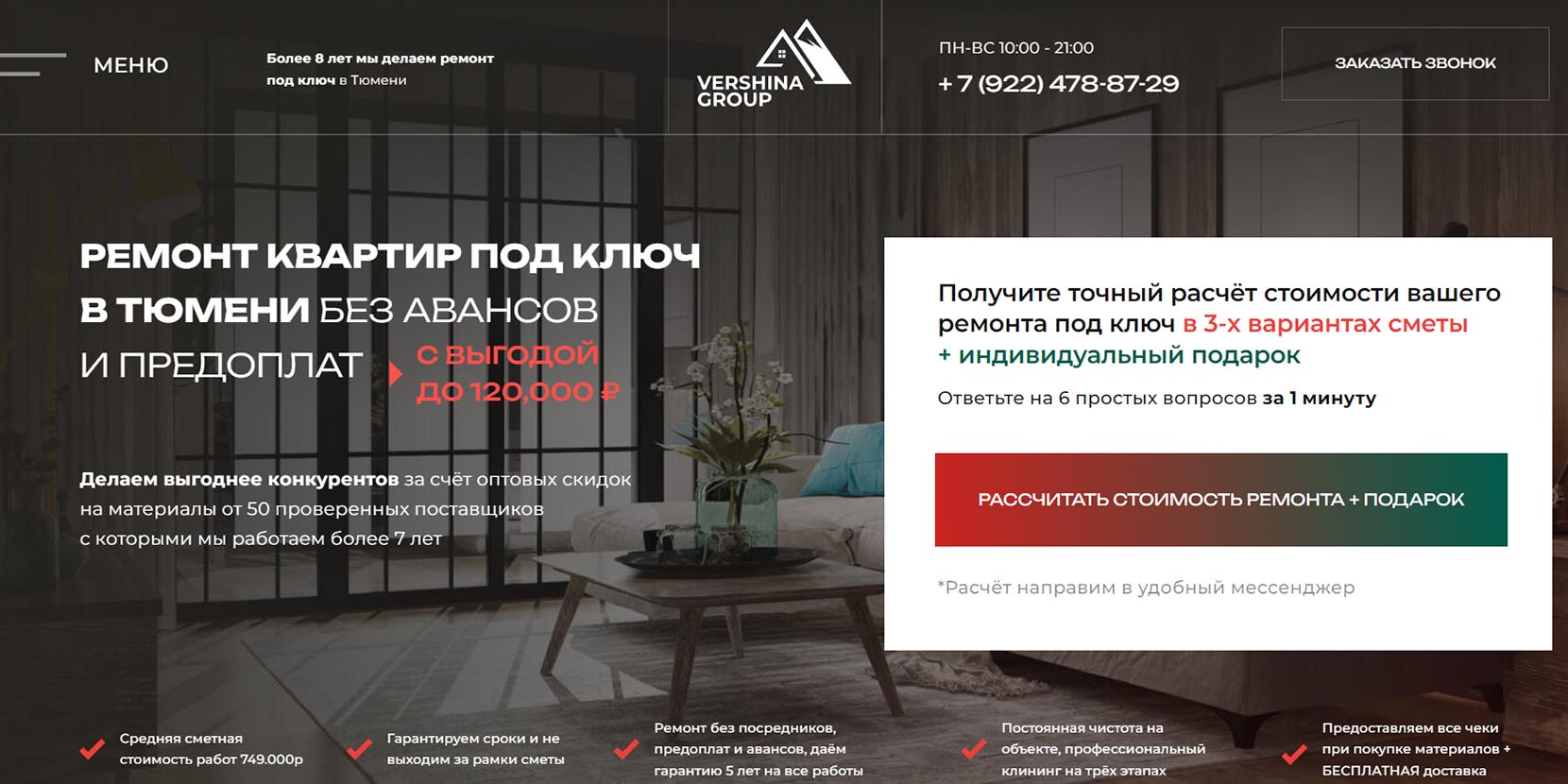 Одна из ведущих ремонтных компаний Тюмени. Успешно реализовали более 500 проектов разного уровня сложности. Предоставляют полный пакет услуг: начиная от приемки квартиры у застройщика и заканчивая подбором мебели. Делают черновой, косметический и капитальный ремонт с подробными фотоотчетами по проводимым работам и закупкам. Квартиру клиента после ремонта оставляют в идеальном состоянии, полностью готовую к заселению. Гарантия на работы — до 2 лет.