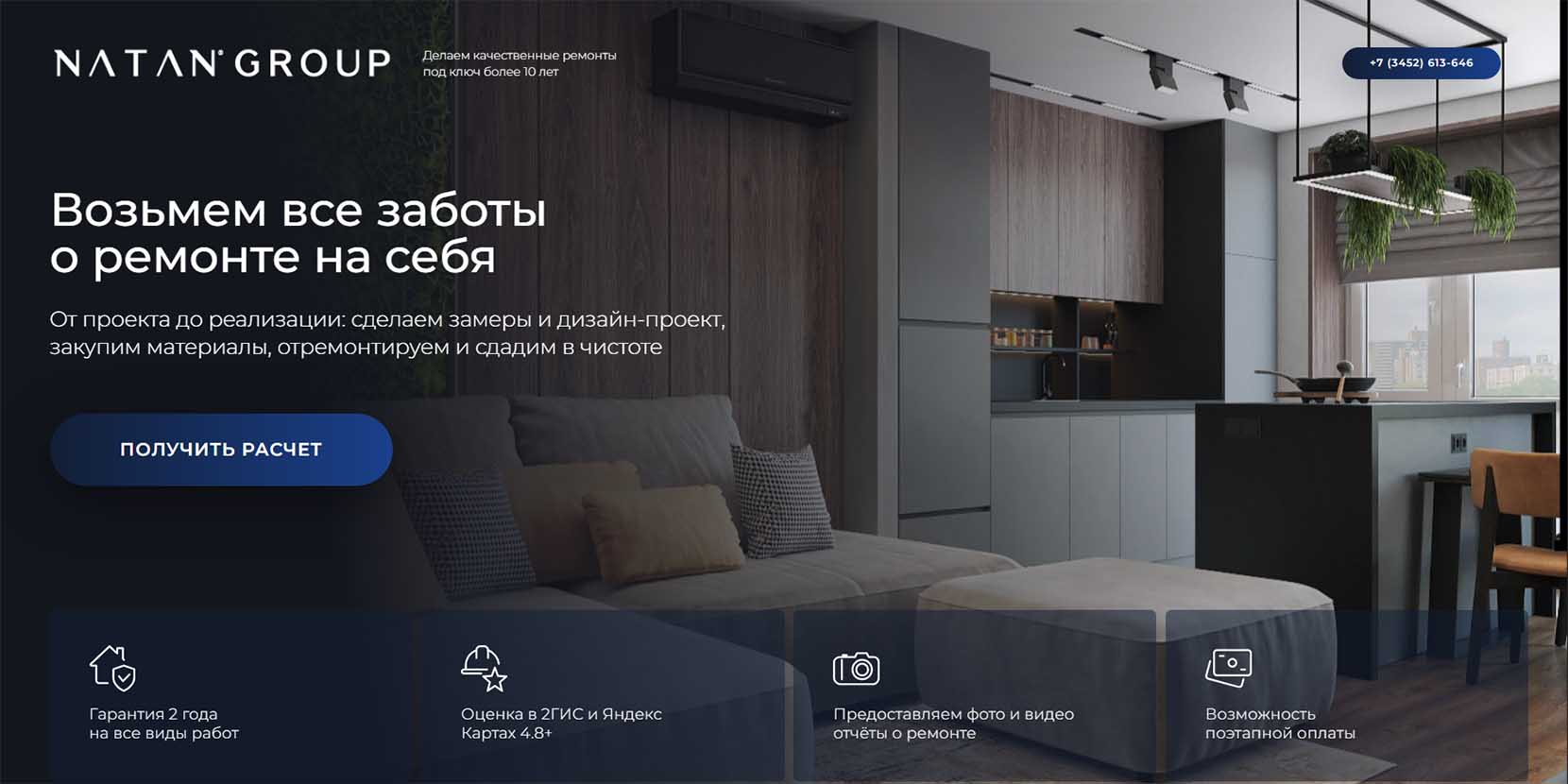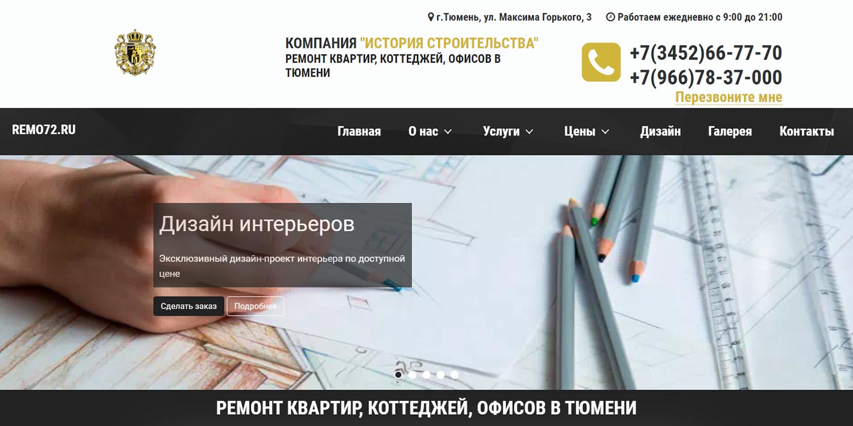 В портфолио этой тюменской компании выполненные ремонты не только в жилых помещениях, но и в коммерческих и общественных пространствах — пекарни, поликлиника, легкоатлетический манеж. Компания гордится тем, что принимает участие в крупных муниципальных проектах. Для потенциальных клиентов есть бесплатная экскурсия по действующим объектам. Ремонтная бригада аккуратно планирует сроки ремонта и строго их соблюдает. Контролировать ход работ можно удаленно.
