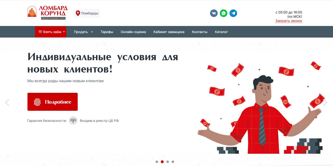 Часть сети ювелирных ломбардов, где принимаются под залог платина, золото и серебро любой пробы. На оценку можно предоставить золотые и платиновые украшения, часы из тех же металлов, столовое серебро, драгметаллы в слитках, а также монеты и жетоны. Стоимость бриллиантов при оценке учитывается. На сайте доступна предварительная оценка по граммам золота.