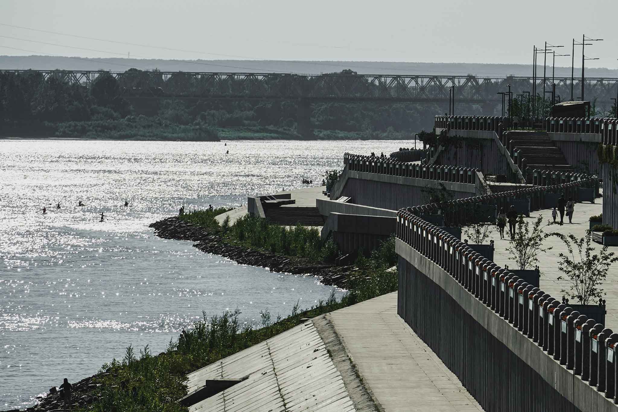 Эффектный променад на правом берегу Белой тянется на 7 км и состоит из четырех уровней, которые сообщаются между собой дорожками и лестницами. Аккуратные террасы вымощены плиткой, имеют ажурные металлические ограды. На набережной работают кафе и рестораны. Много удобных скамеек, широких деревянных лавочек-шезлонгов, где приятно отдыхать, наблюдать за рекой и противоположным берегом Белой.