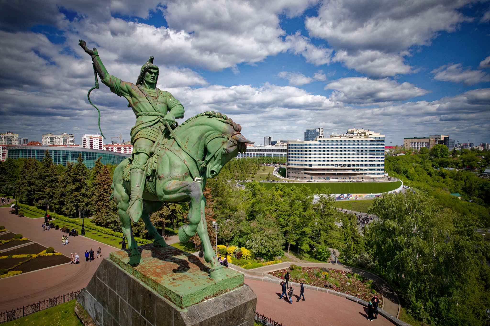 Одна из визитных карточек Уфы — выразительный монумент на берегу реки, посвященный народному герою, сподвижнику Емельяна Пугачева и смелому борцу за свободу башкир. На памятнике из прочного бронзированного чугуна Салават Юлаев изображен сидящим на коне. На запястье правой руки виднеется плеть, а на левом боку — сабля. Рядом раскинулся живописный парк, где можно хорошо провести время и отдохнуть.