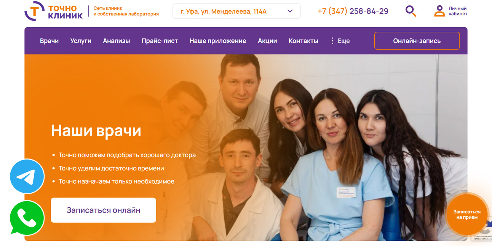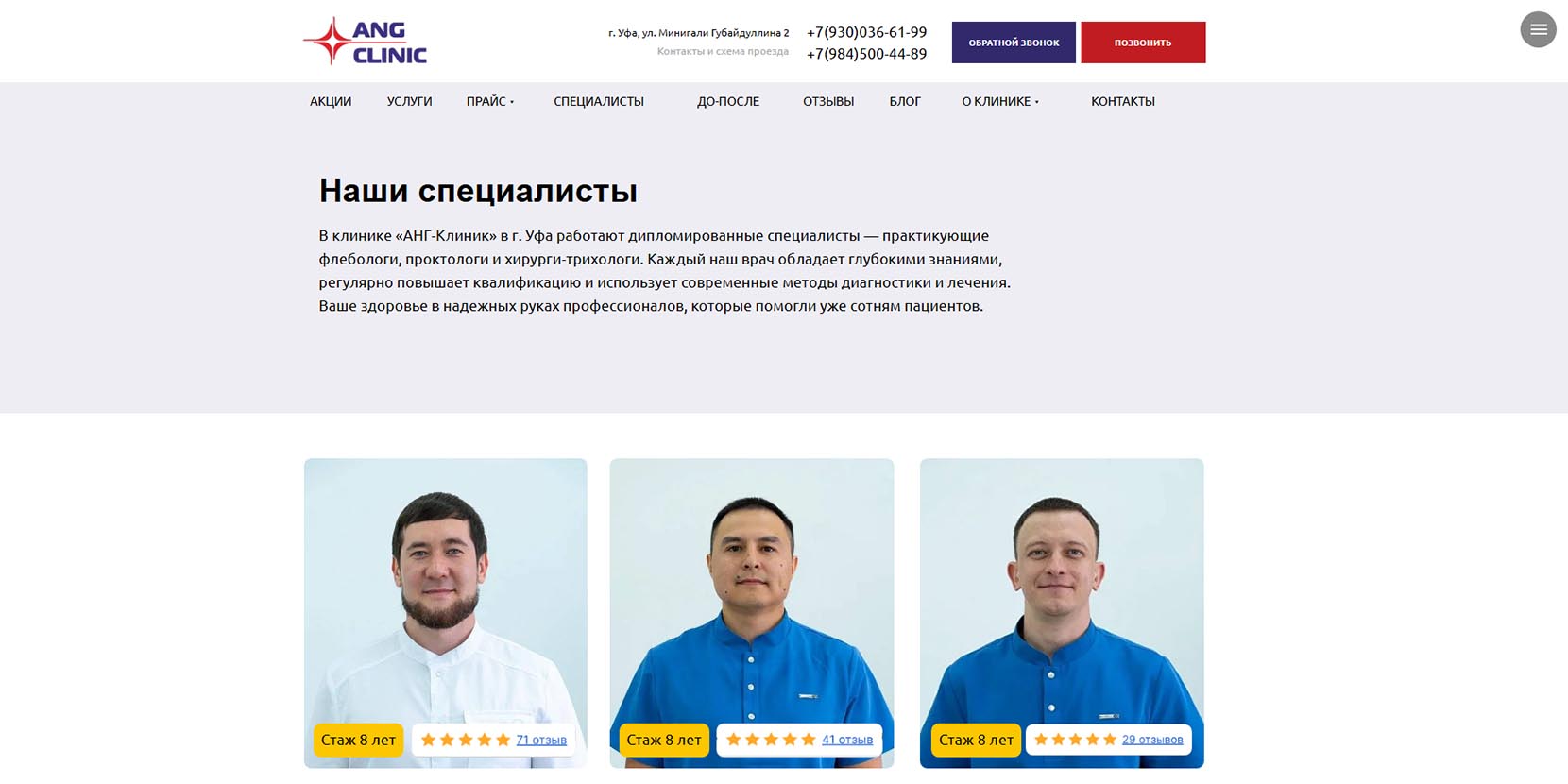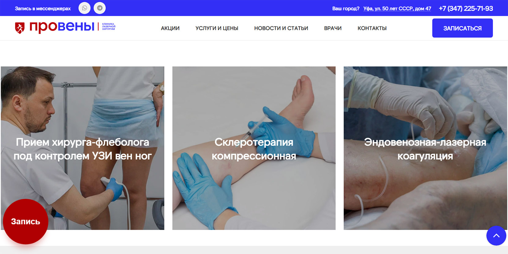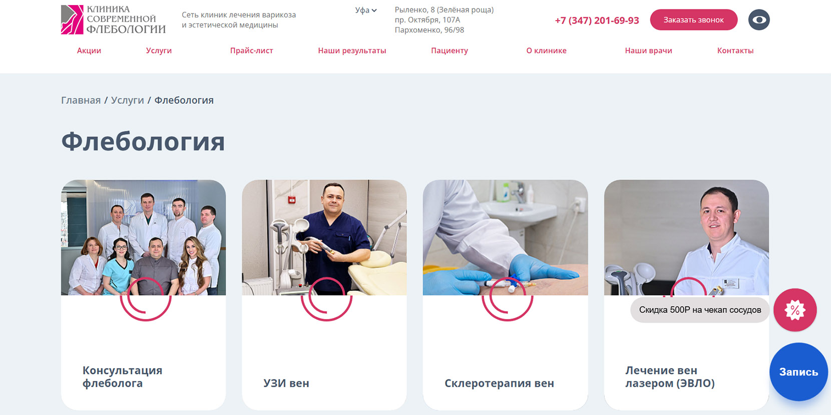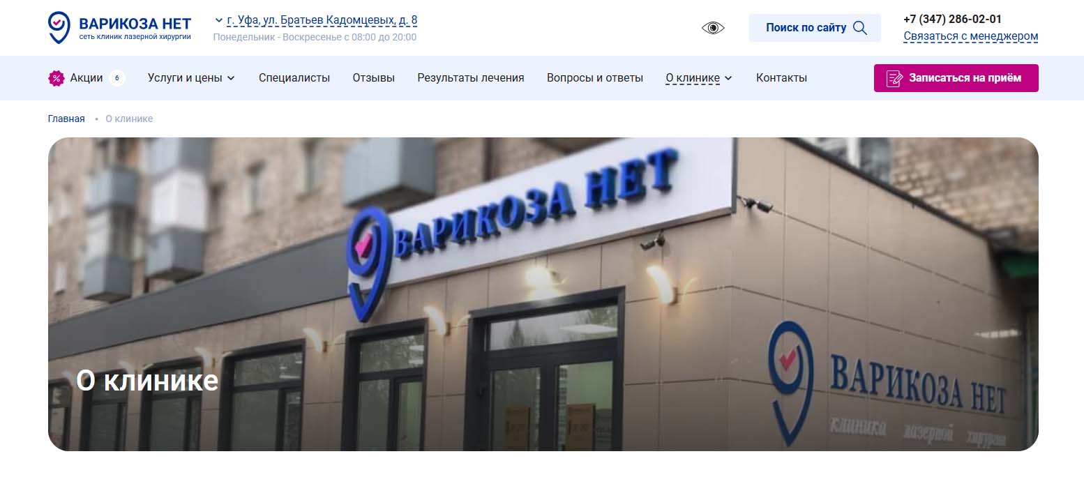 В 2024 году центр флебологии вошел в топ‑10 частных клиник Башкирии по версии медицинского онлайн-агрегатора. В медцентре работают флебологи и сосудистые хирурги высшей квалификационной категории с опытом от 15 лет. Перед лечением специалисты проводят УЗИ вен на аппарате экспертного класса с оценкой кровотока и составлением индивидуального плана. Применяют малоинвазивные методы лечения: эндовазальная лазерная коагуляция, минифлебэктомия, склеротерапия. Процедуры проводятся амбулаторно и не требуют наркоза.