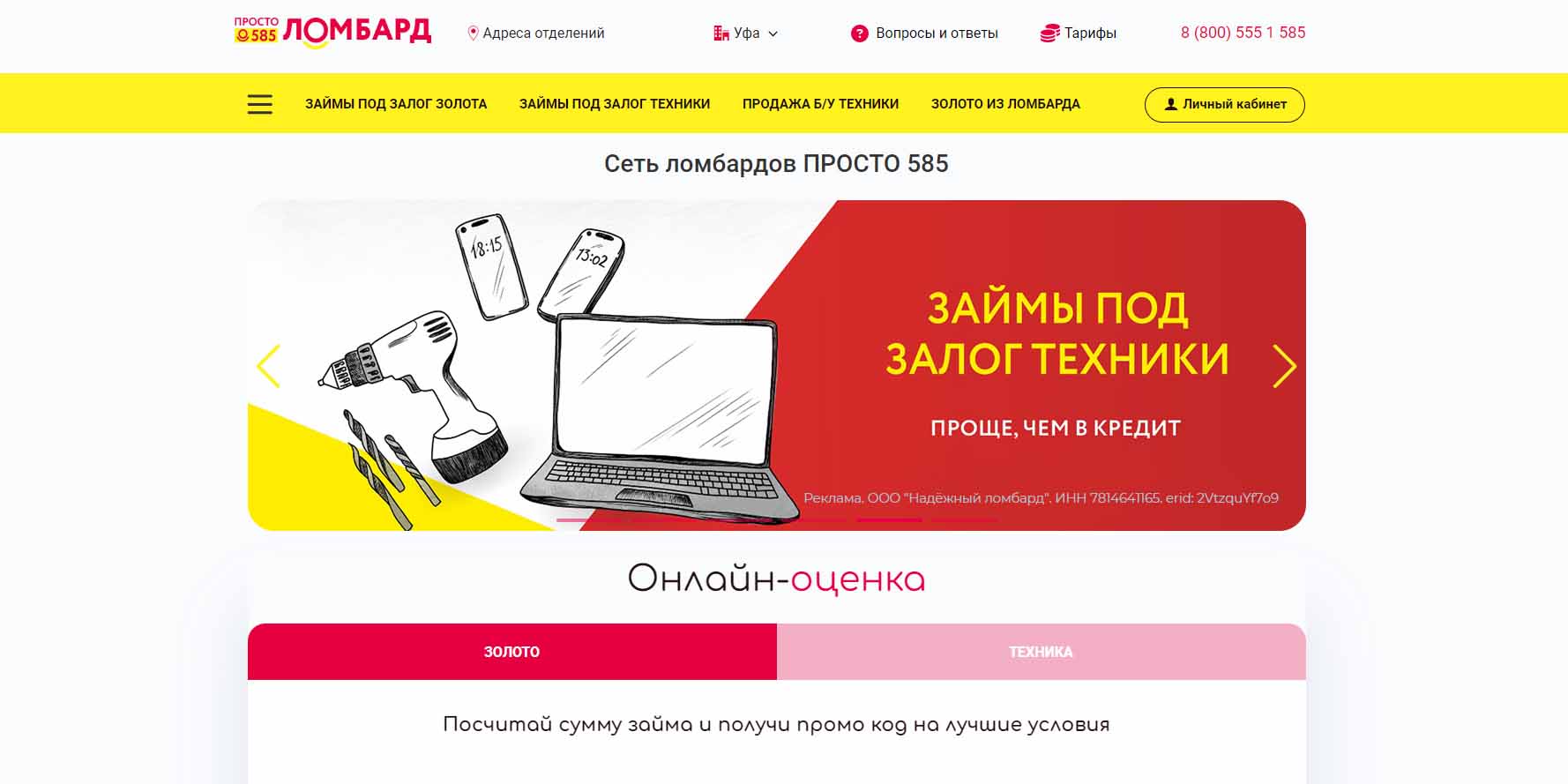 Федеральная сеть ломбардов, специализирующаяся на ювелирных украшениях, часах и драгоценных металлах. Для оформления потребуется только сам предмет и документ, удостоверяющий личность. На сайте компании есть предварительный расчет процентной ставки и размера займа. Отделения ломбарда расположены в разных районах Уфы — около 10 филиалов.