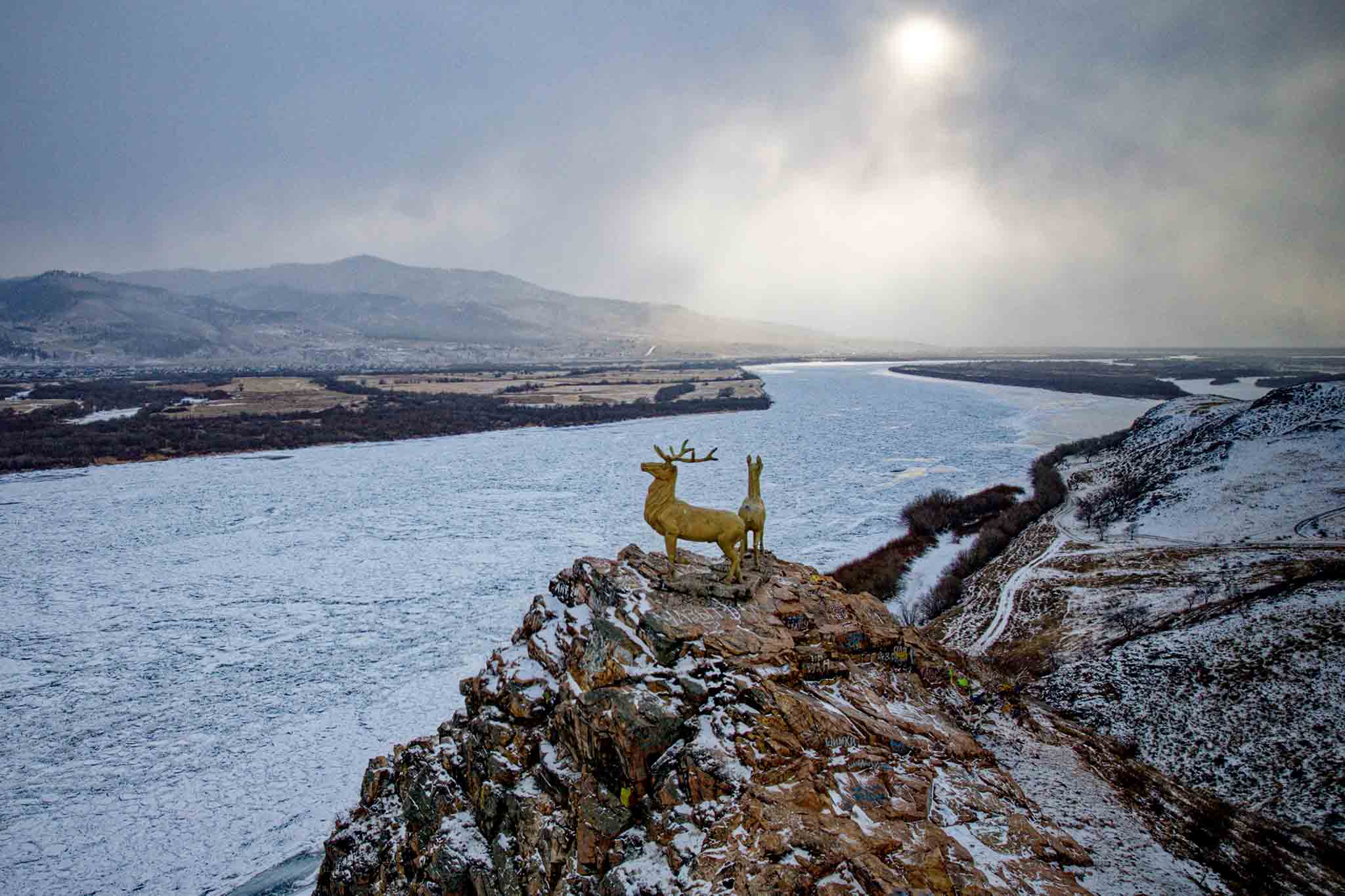 Скульптура «Олени» расположена на Шаманских горах, на высоком скалистом берегу реки Селенги. Это скульптурная композиция уже стала своего рода визитной карточкой Бурятии. Выпускники школ даже приезжают сюда встречать рассвет. В метрах ста от скульптур находится «стоянка Гэсэра». Легенда гласит, что в этом месте, привязав своих небесных коней, отдыхал Гэсэр-хан (персонаж эпоса, герой, бог войны, сражавшийся с демонами). Там есть коновязные столбы — сэрге, беседка, информационный стенд и камень с древней символикой.
