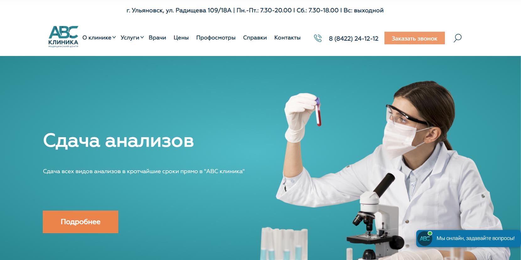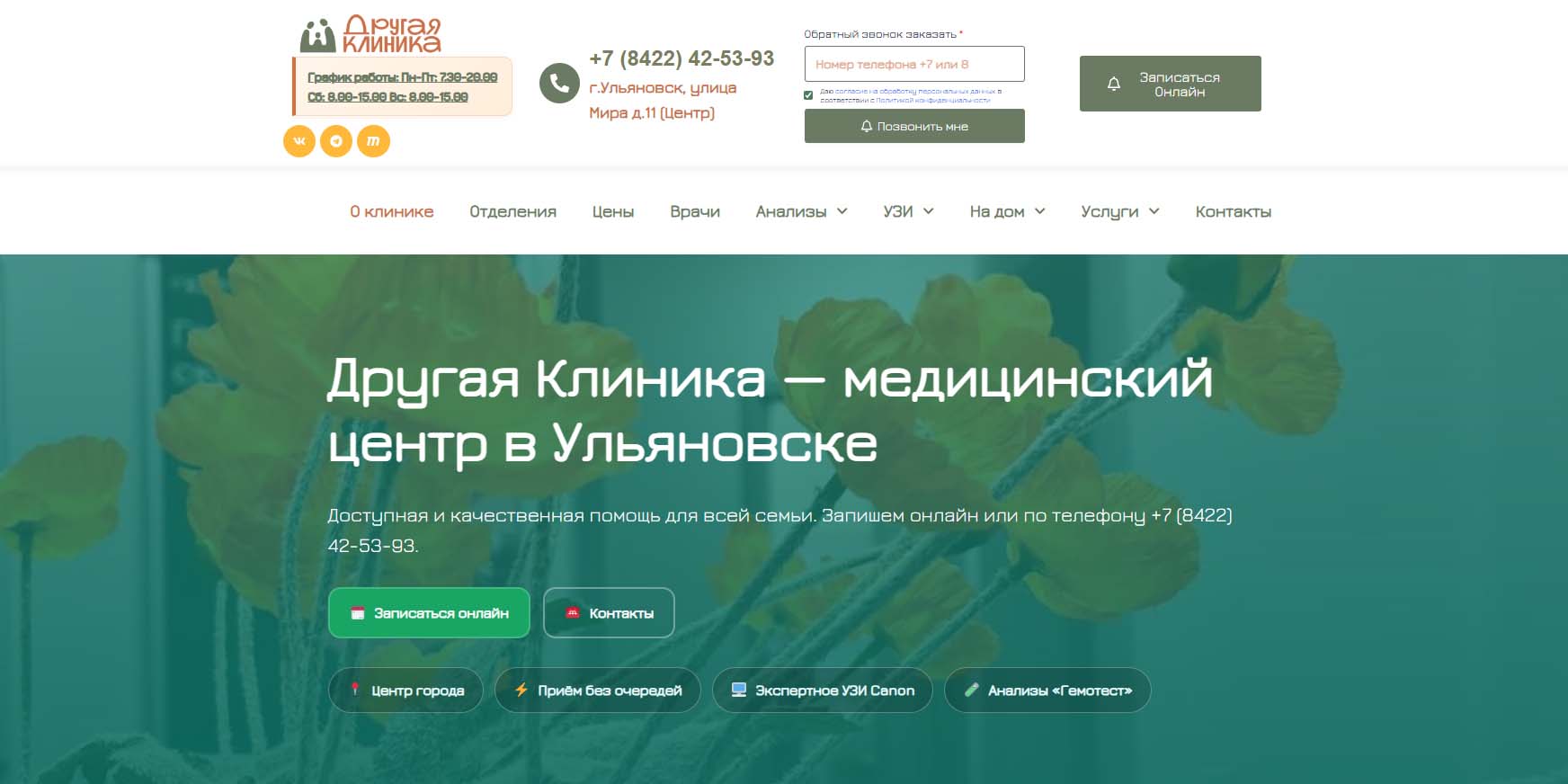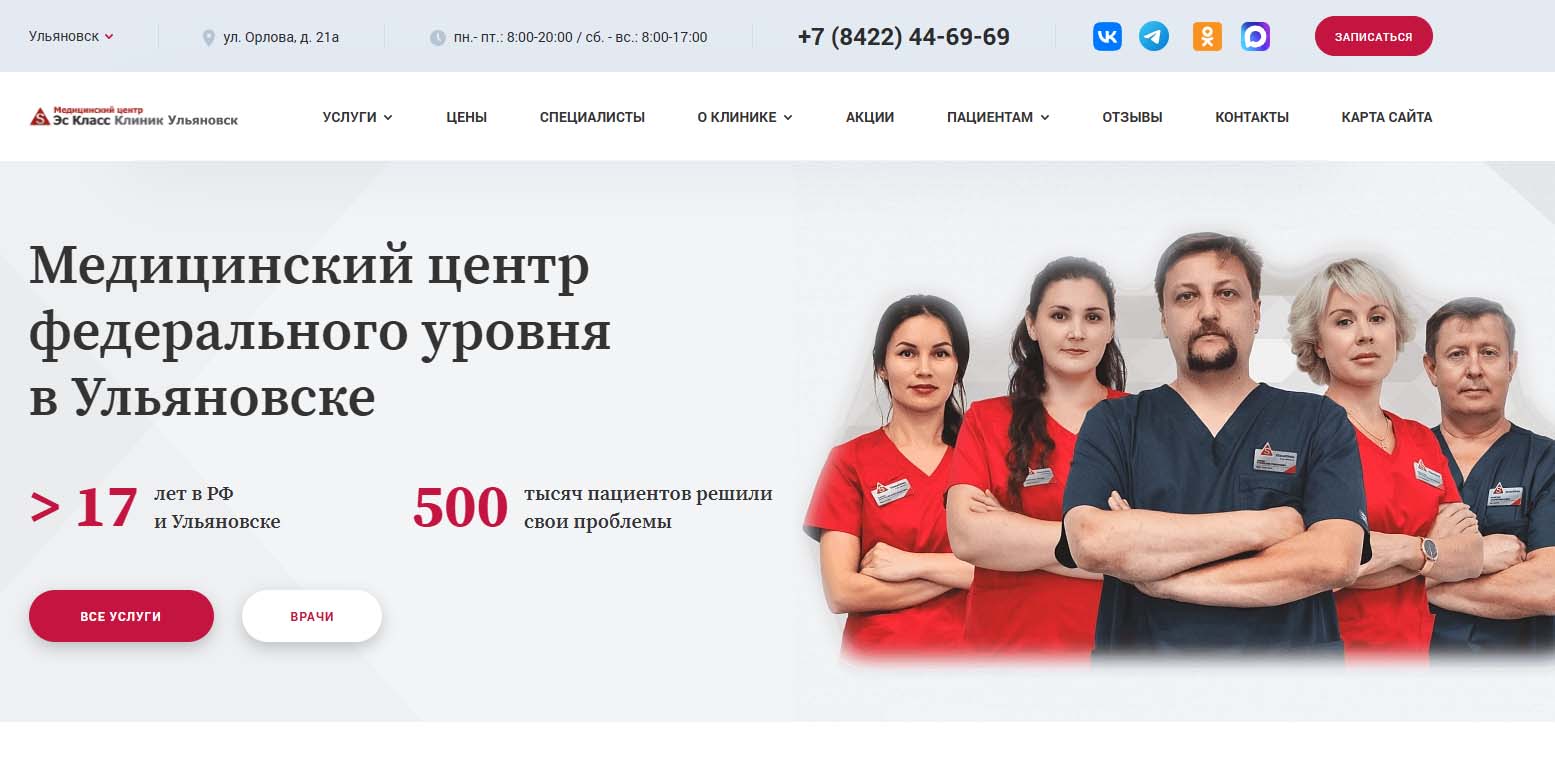 Клиника федеральной сети в Ульяновске, где оказывают услуги по более чем 30 специализациям — гинекология, проктология, флебология, травматология, неврология, кардиология, стоматология, дерматология, педиатрия, онкология и другие. Средний стаж специалистов — более 20 лет. Каждый центр оснащен диагностическими инструментами — УЗИ, рентген, МРТ, КТ, есть лабораторные исследования. Основное направление работы — малоинвазивная хирургия, поэтому на базе центра работают операционная, где проводят пластические и бариатрические операции, круглосуточный и дневной стационары.