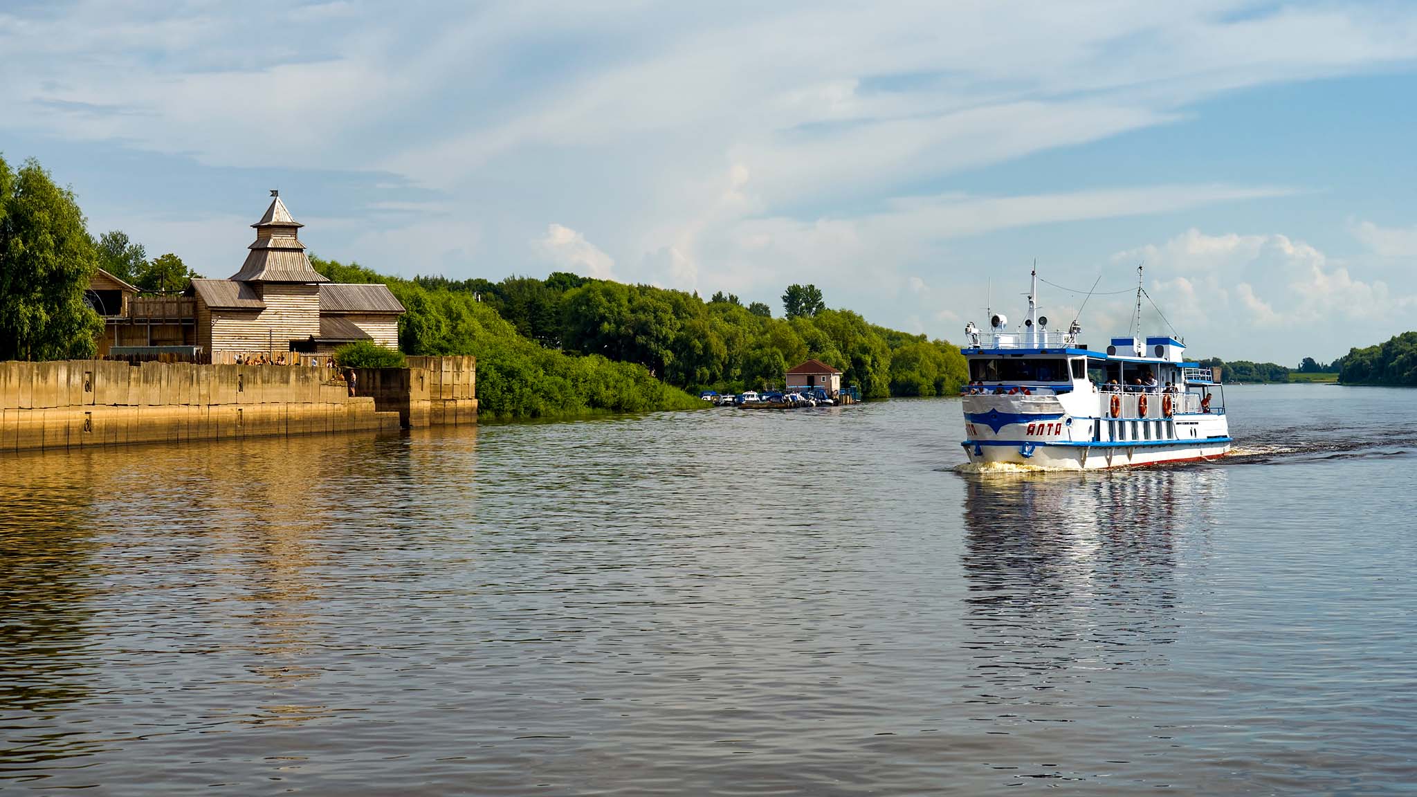 Можно прогуляться по реке Волхов до озера Ильмень на теплоходе. Это будет или просто речная прогулка, или с экскурсией. Капитан делает остановку на Рюриковом городище — месте, где располагался «Старый город».