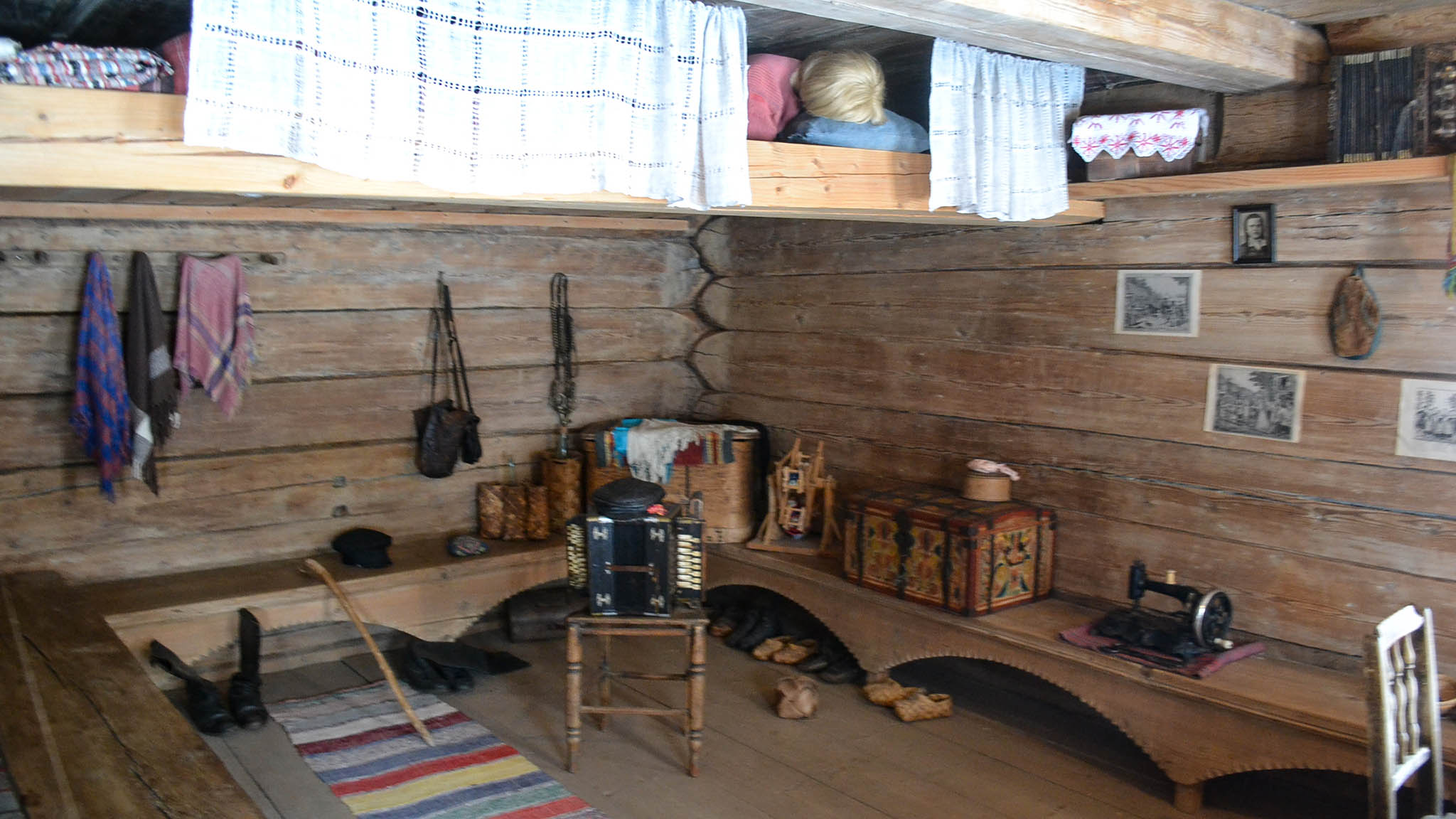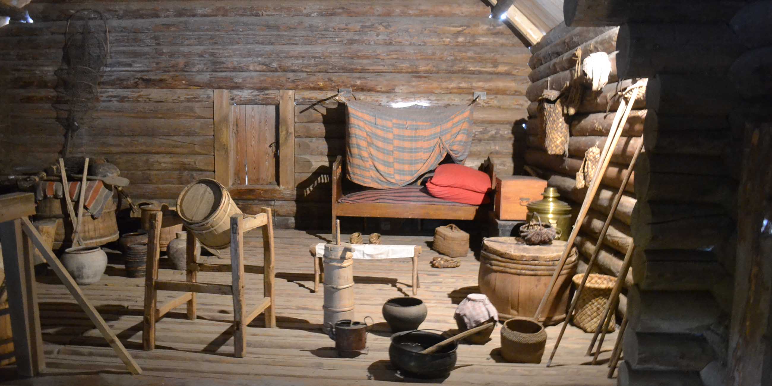 Побывайте в первой избе, которая была перевезена в музей, — это изба Марии Екимовой из деревни Рышево. Постройка украшена необычными наличниками в виде больших завитков и резным балконом. Внутри половина дома отведена под сени, в которых хранилась важная для ведения хозяйства утварь. Вторая половина предназначена для проживания хозяев — с печкой, полатями, на которых спали взрослые и дети, кухней и большой просторной гостиной. Вы немало удивитесь, насколько маленькое пространство между полатями и потолком. Зато тут было тепло спать.