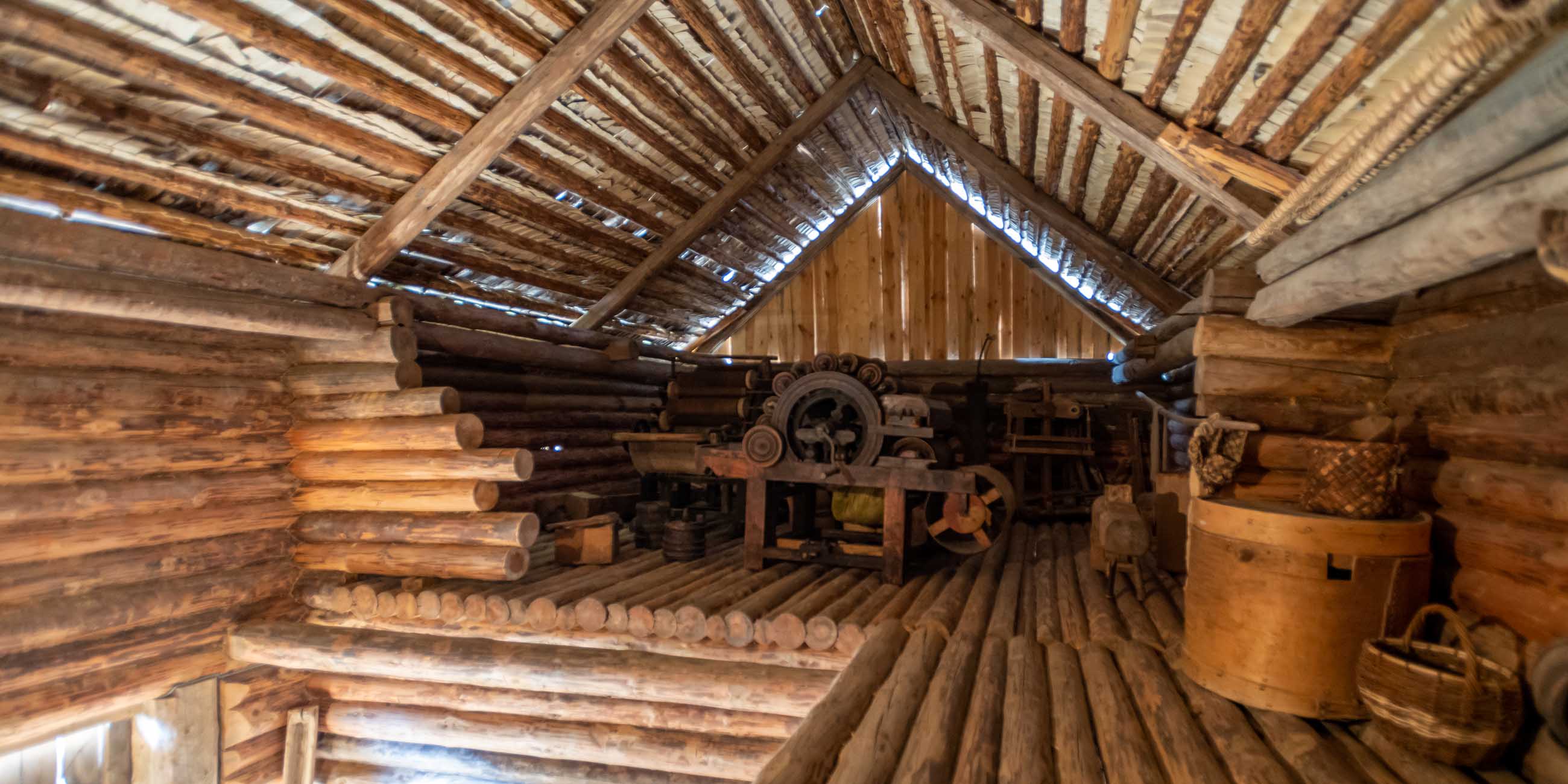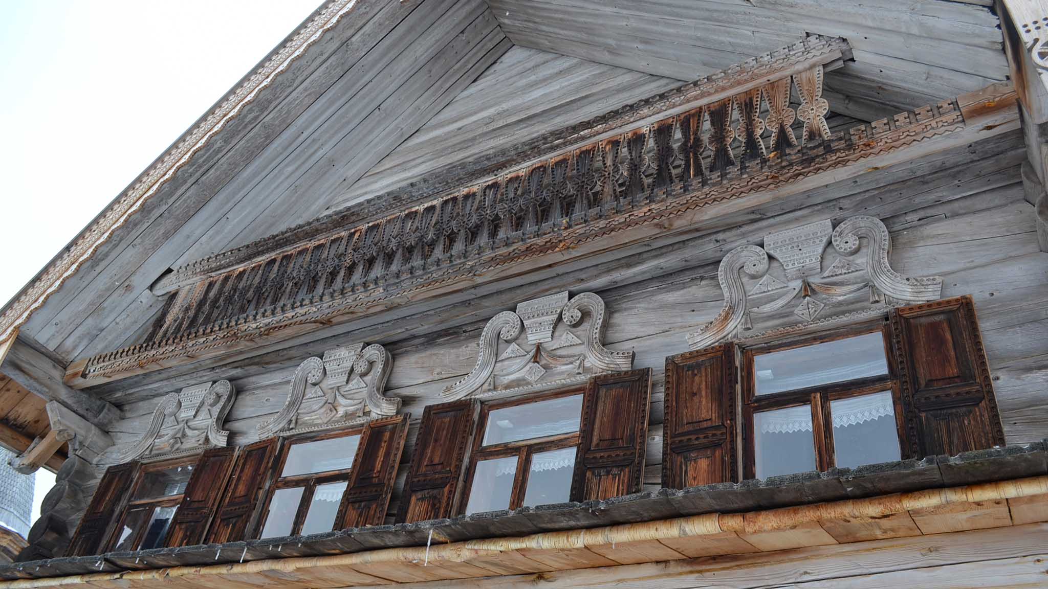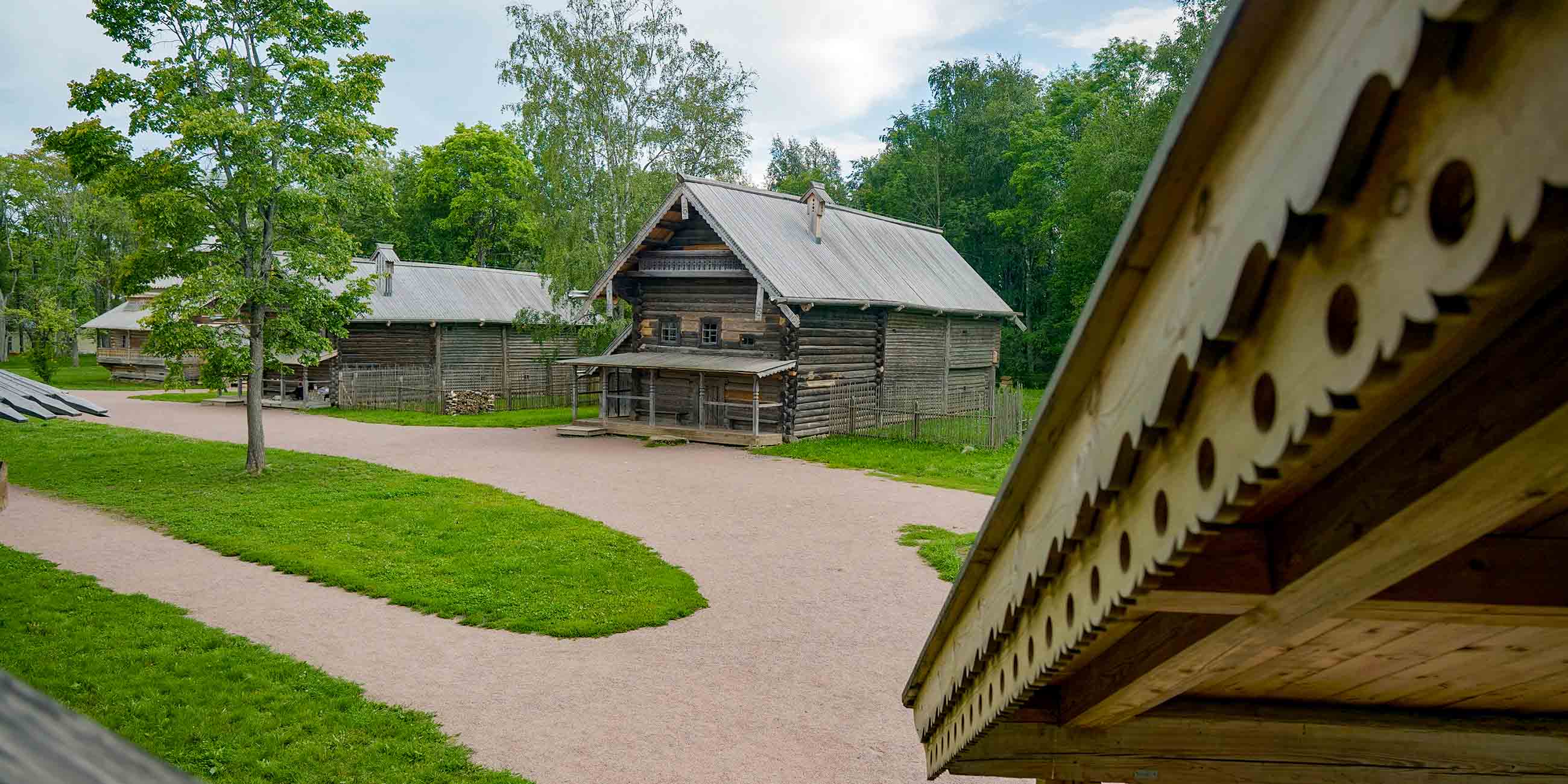 Если пойти от входа налево, увидите стоящие рядом три избы, привезенные из разных деревень. Они двухэтажные, так что вам откроется вид сверху на некоторые близстоящие строения.
