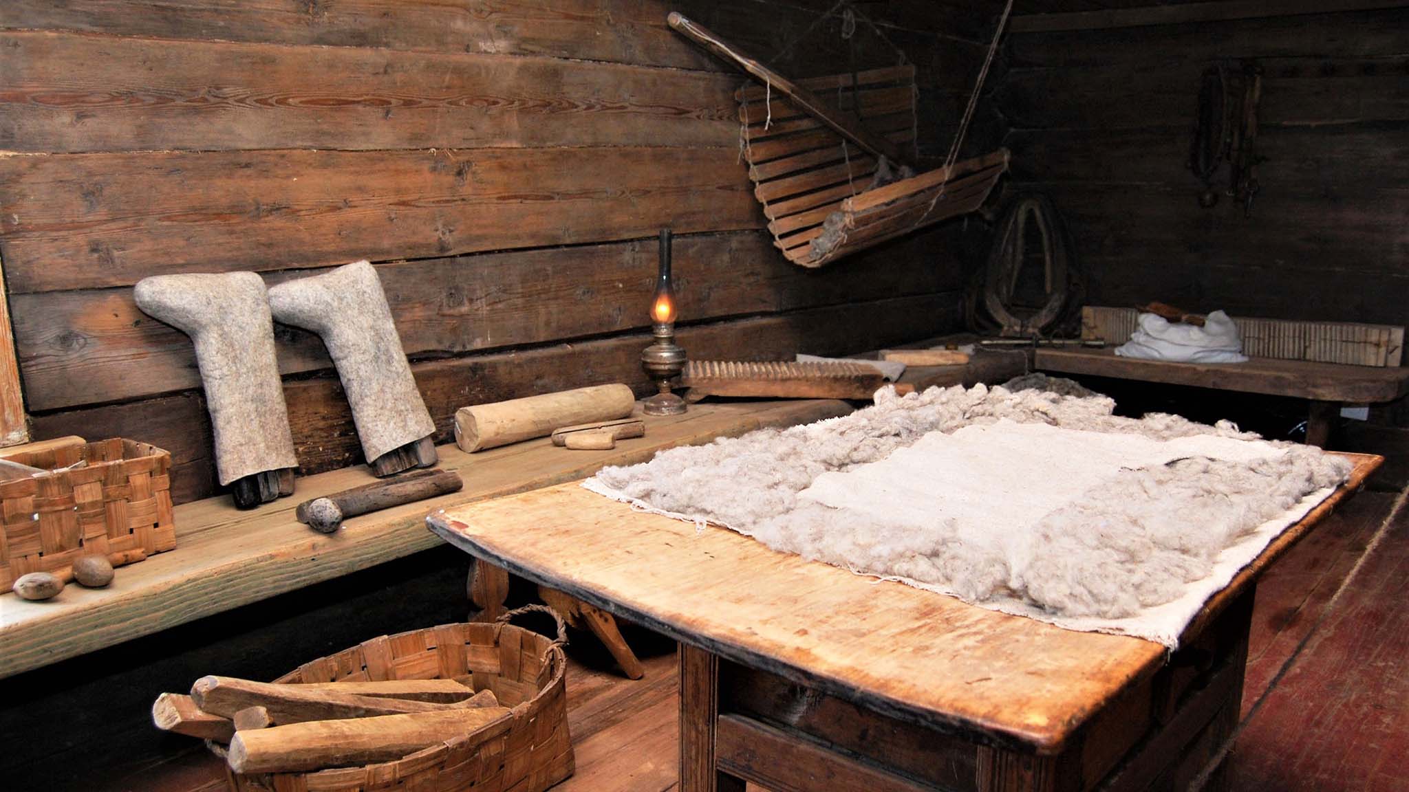 А в двойной избе Добровольских (одна часть — теплая зимняя, а вторая — летняя) открыта экспозиция «Приход торговца». Торговцы появились в деревне, когда та в конце XVIII века стала потреблять городские товары — ткани, меха, платки. Продавали все это за наличные или обменивали на крестьянскую продукцию — яйца, молоко и прочее. Во время экскурсии можно поучаствовать в мастер-классе валяния шерстяных изделий.