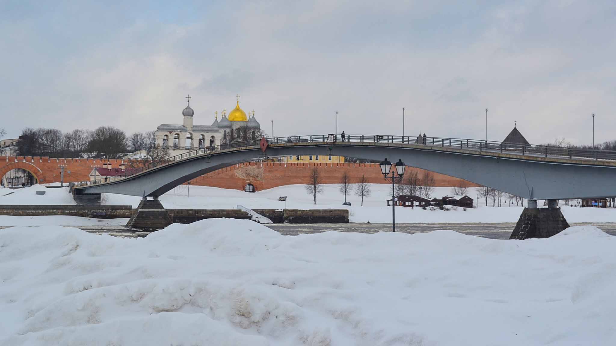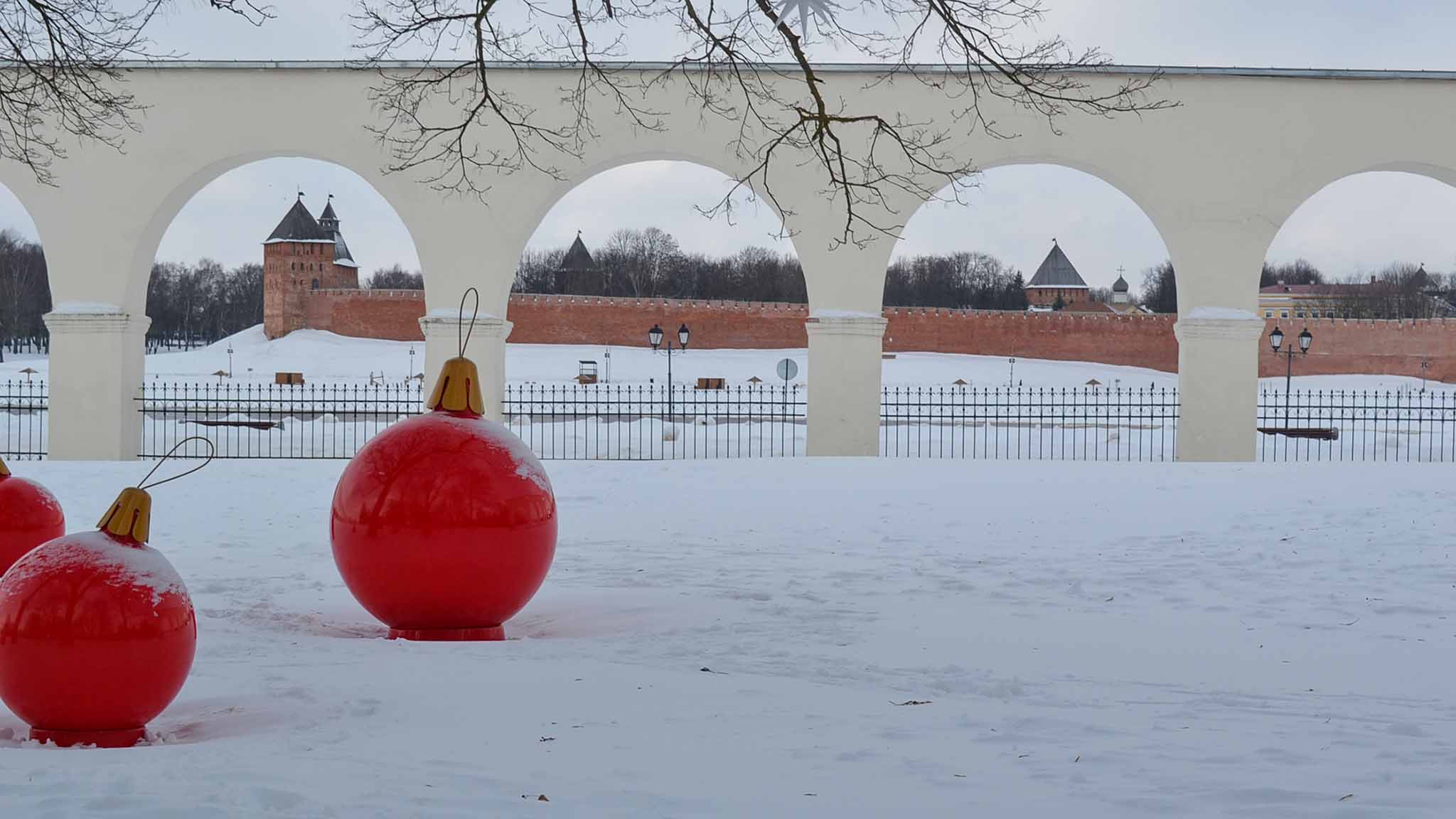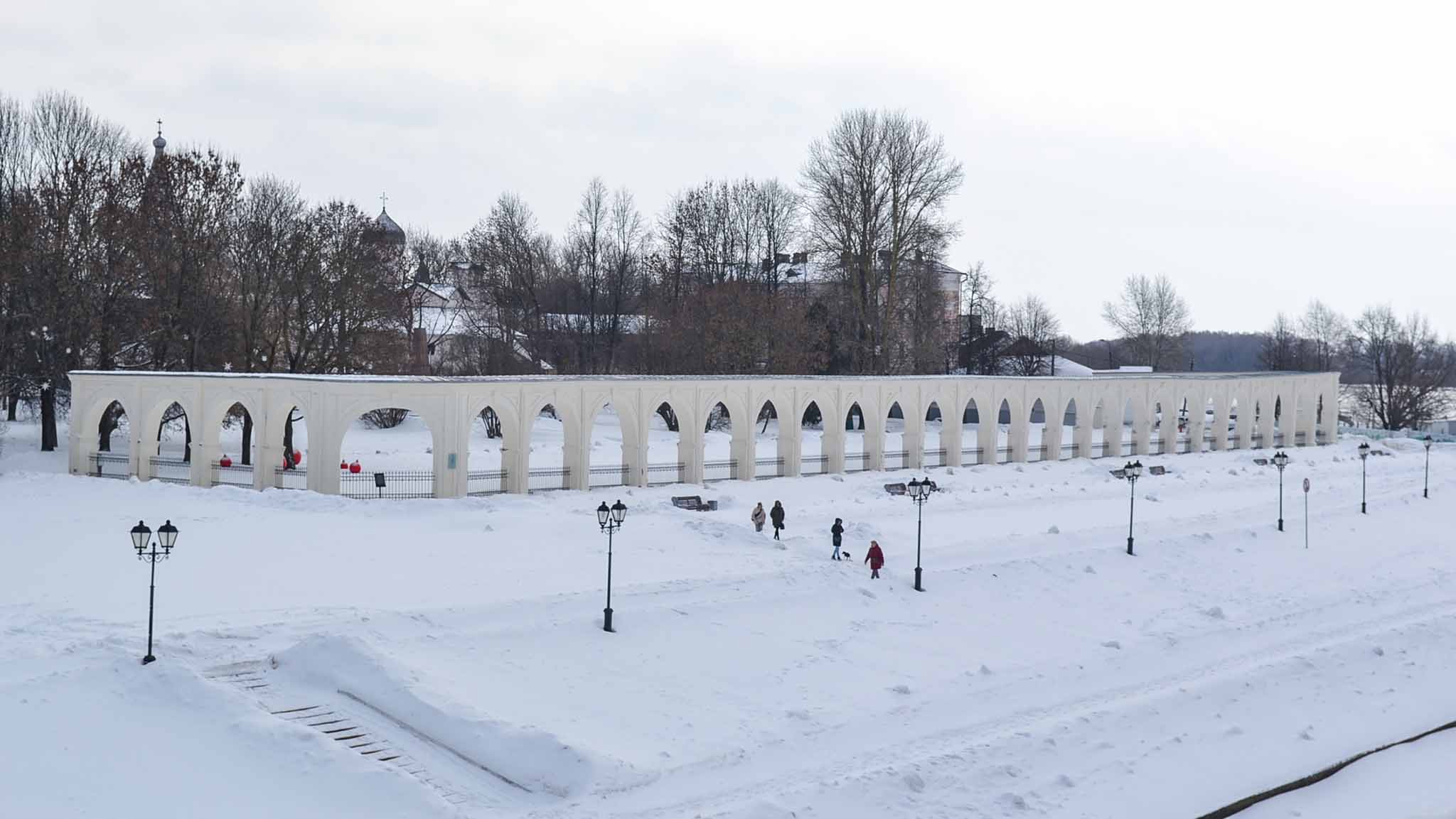 Гуляя зимой по берегам реки Волхов в древней части Великого Новгорода, легко погружаешься в его историю. Здесь укрыт снегом древний Новгородский кремль, возвышающийся над рекой на 10 метров. Гостей в новогодние каникулы в стенах крепости встречает языческий Дед Трескун, а по набережной можно прокатиться на санях с ямщиком.