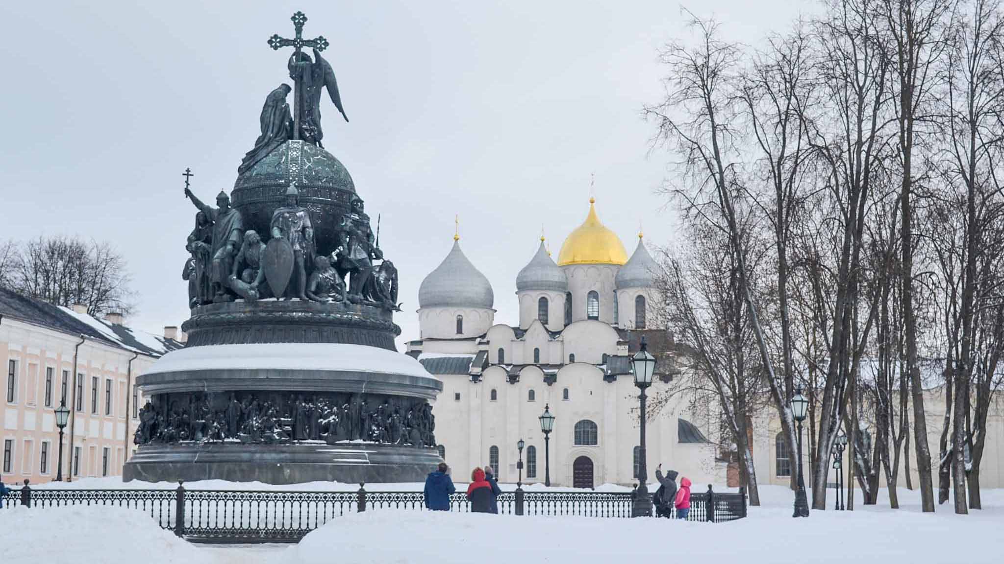 Через застывшую реку Волхов перекинулся Горбатый мост. По нему можно быстро перебраться к стенам Кремля, за которыми комфортно прятаться от ветра. Тут посетителей ждут древний Софийский собор, Краеведческий музей с берестяными грамотами, Владычная палата, экспонаты которой рассказывают о быте новгородских архиереев, и знаменитый памятник «Тысячелетие России».