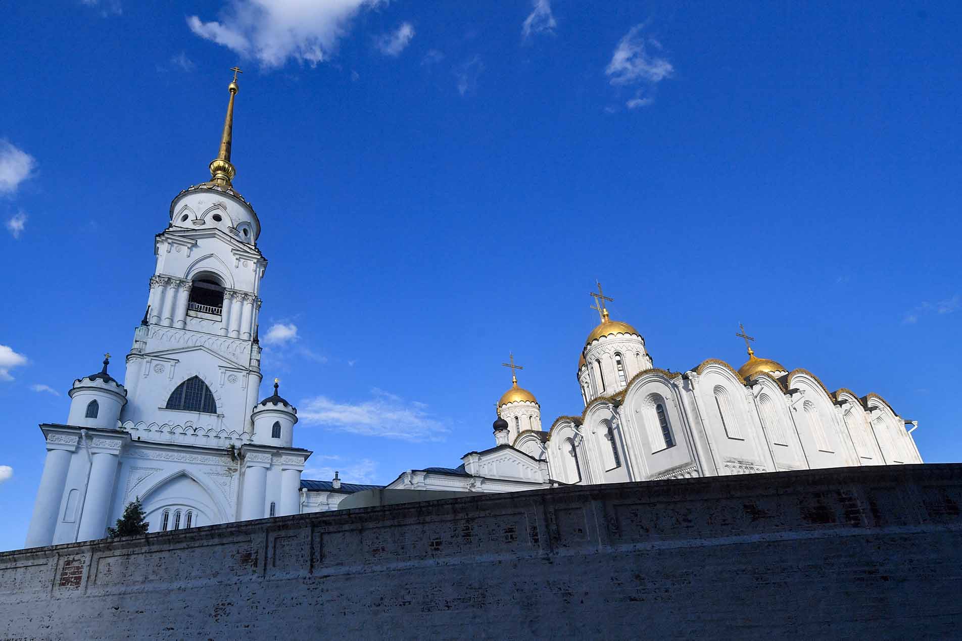 Успенский храм — главный в городе. Это кафедральный собор Владимирской епархии. Пятикупольное строение XII века выполнено из белого камня. Сейчас тут проходят богослужения, а раньше в нем венчали на великое княжение правителей Руси. Также он стал усыпальницей для семей князей и духовенства. Внутри храма сохранились фрески выдающихся иконописцев Андрея Рублева и Даниила Черного.