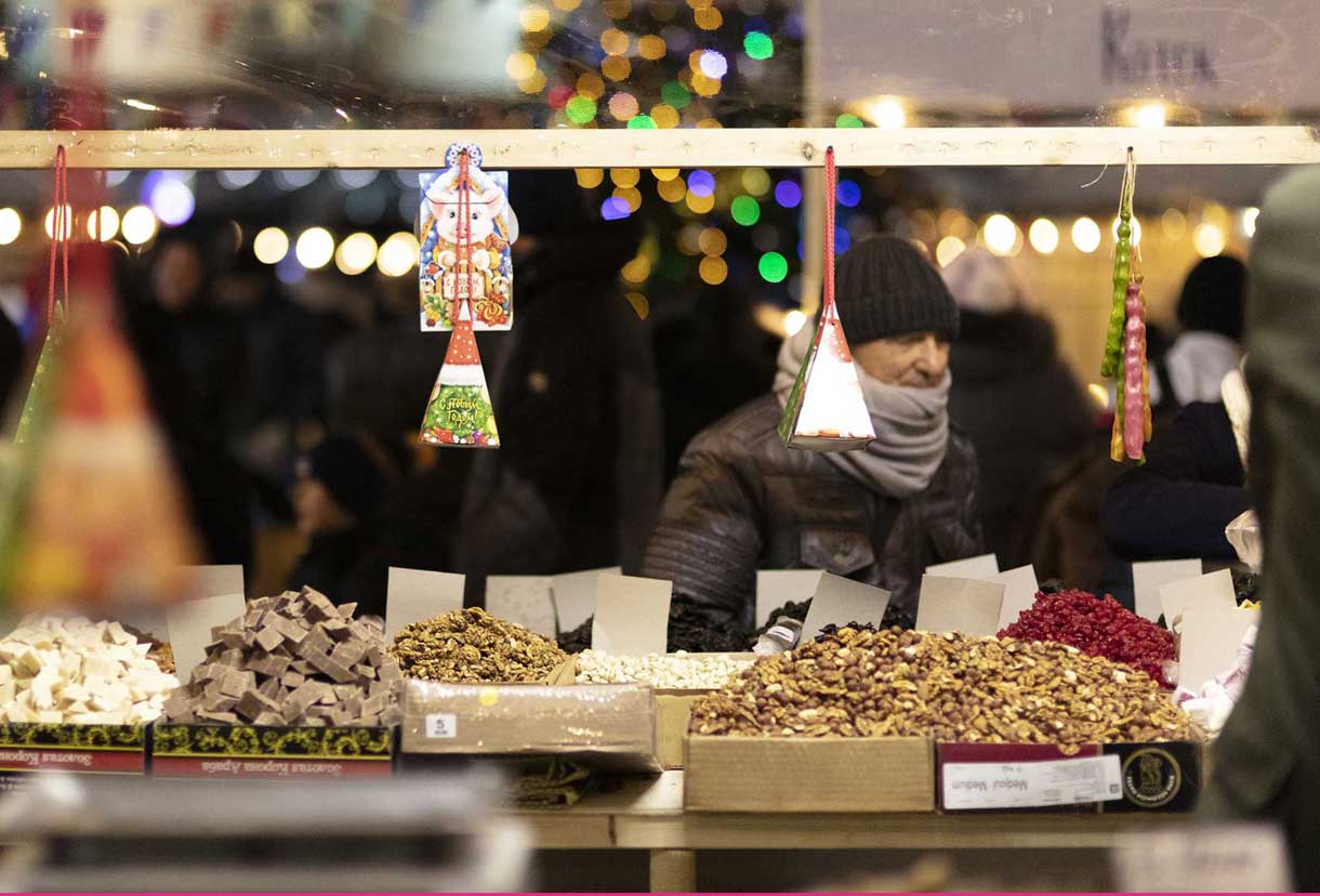 Рядом с елкой на самой площади традиционно строят новогодний городок со снежными крепостями и фигурами, устанавливают фотозоны, заливают бесплатный каток. Чтобы гостям праздника было удобнее, на площади устанавливают торговые павильоны с сувенирами, угощениями и теплыми напитками. Павильоны тоже вписывают в атмосферу праздника, стилизуя под ярмарки.