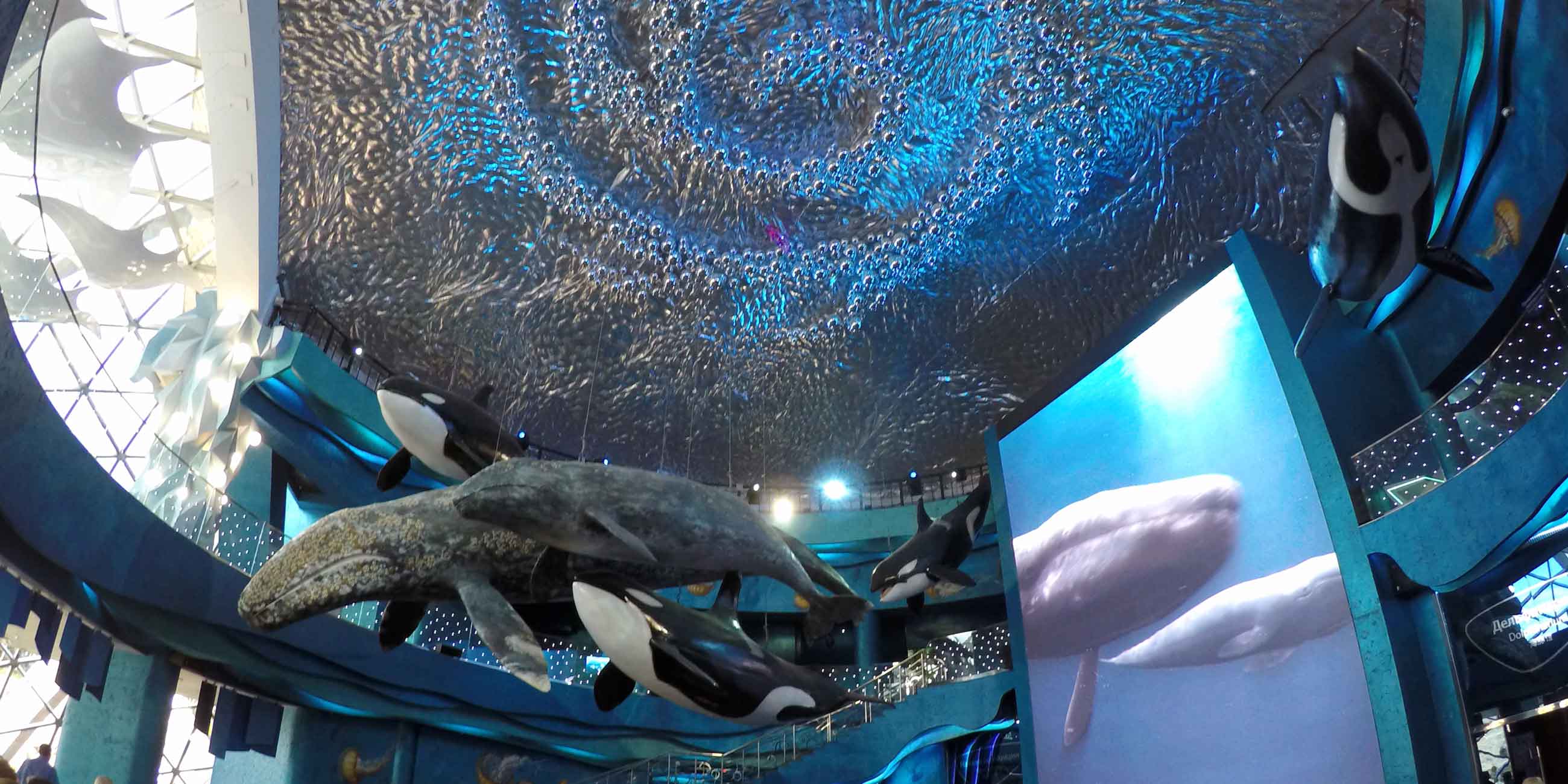 Отдельно в океанариуме работает дельфинарий (но с 30 сентября по 25 декабря 2025 года он будет закрыт на ремонт). Здесь гостей развлекают тренированные дельфины, белухи и обворожительный морж Миша — спортсмен и музыкант, играющий на разных инструментах.