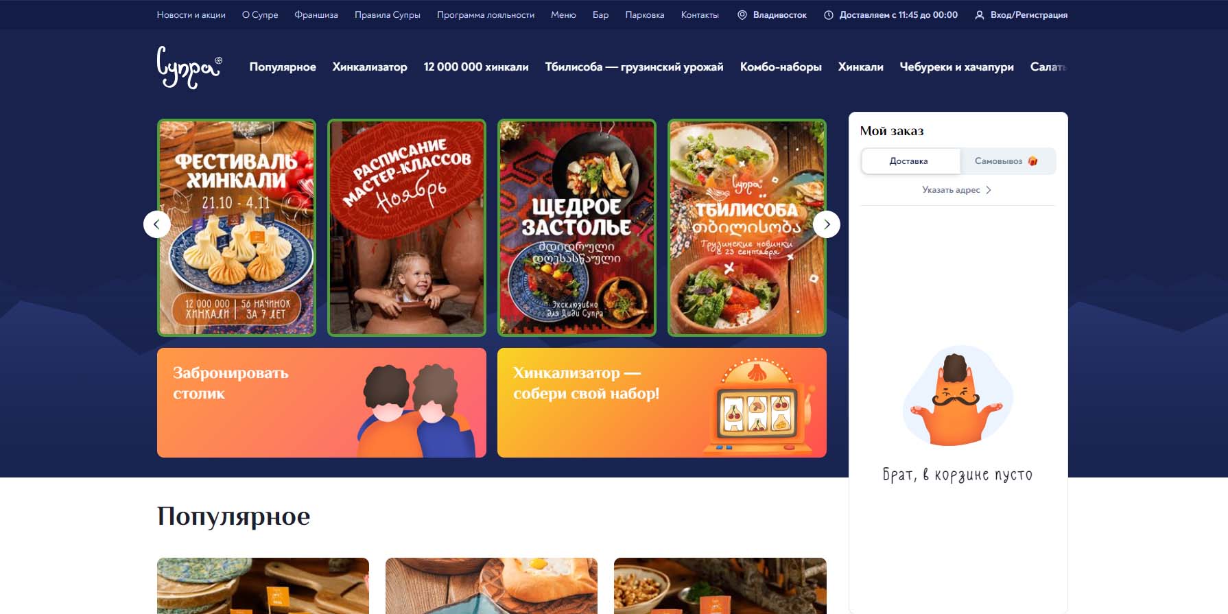 Атмосфера праздника в грузинских ресторанах «Супра» царит круглый год. В каждом из заведений сети шумно, душевно и весело. Ресторан не раз становился обладателем национальных премий. Здесь уверяют, что уже слепили для своих гостей более 10 млн хинкали, испекли свыше 250 тонн хачапури и разлили по бокалам около тысячи бочек вина.