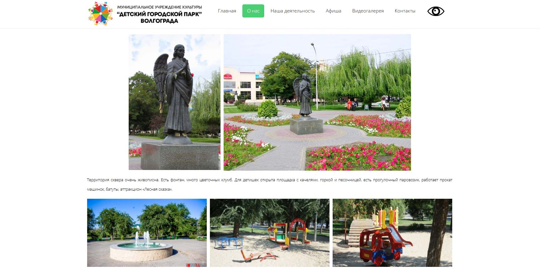 Сад в самом центре Волгограда, граничит с Детским городским парком и прекрасно подходит для прогулки с ребенком. В саду расположена сцена для выступлений, где вечерами танцуют жители района, а по соседству — небольшая часовня. Для детей оборудована безопасная площадка, есть уличные тренажеры, зона с турниками, колесом от грузовика и гирей — для самых сильных.