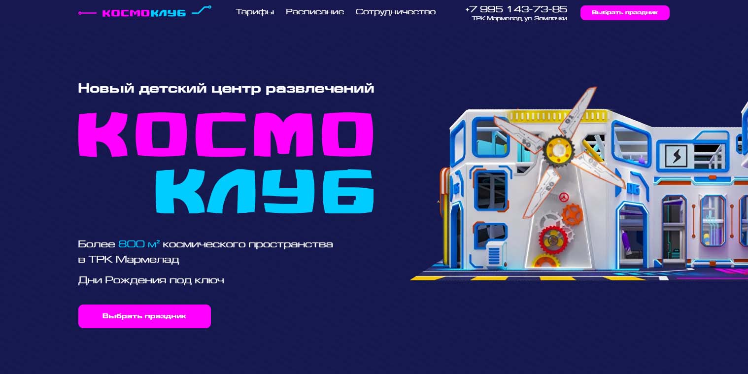 Космическая игровая комната — портал в другой мир, где каждый ребенок становится космонавтом. На площади 800 м² в стилистике космоса размещены лабиринты, батуты, горки и аттракционы; организуются интерактивные квесты по спасению галактики, аниматоры создают эффект присутствия на другой планете.