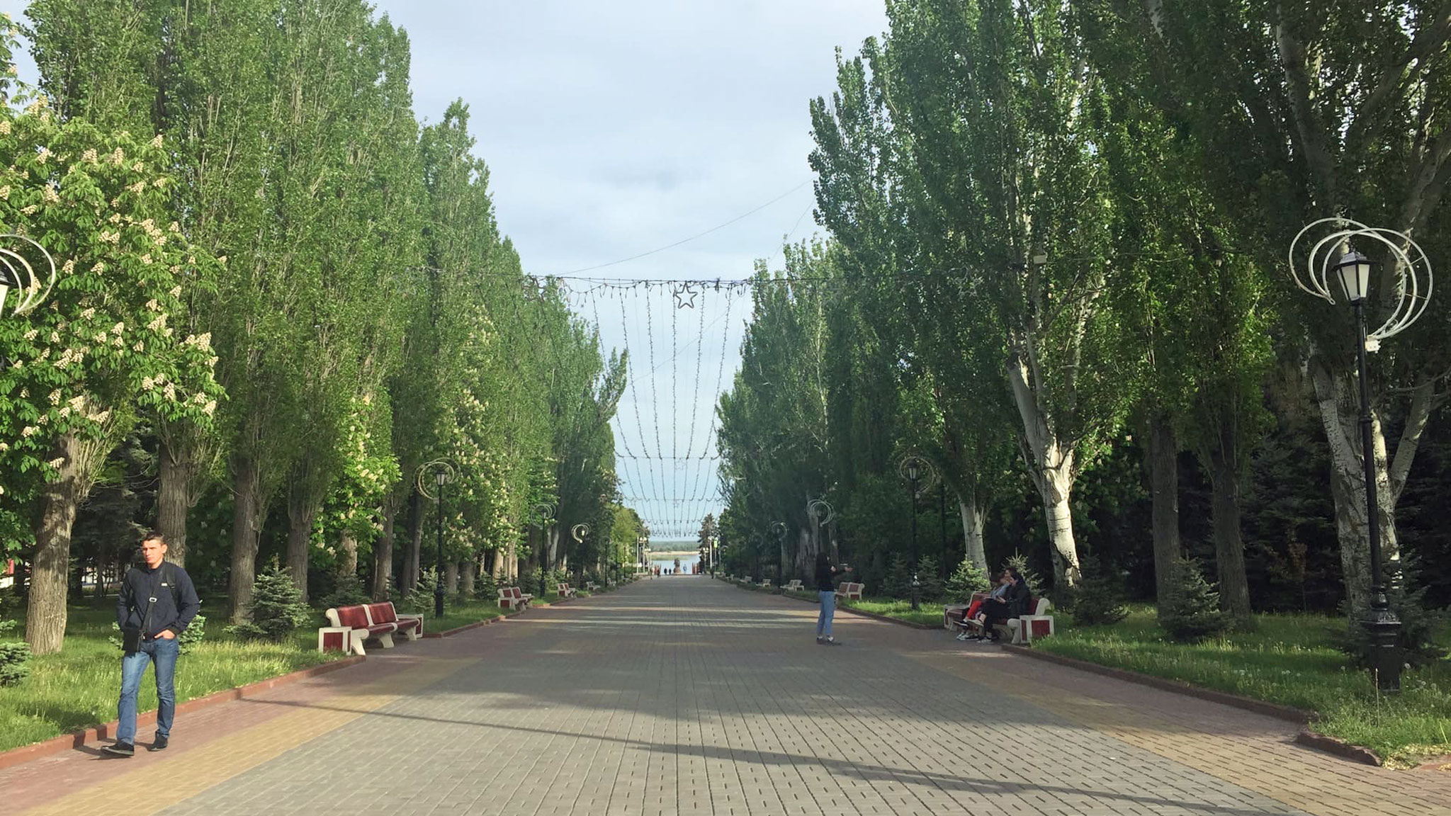 Одна из самых красивых прогулочных зон Волгограда — широкий бульвар с парком Победы. Здесь гуляют вдоль ухоженных аллей, отдыхают на скамейках, фотографируются на фоне Волги. Оборудованы детские площадки, много зелени, клумбы, фонтаны «Искусство» и знаменитая центральная лестница с монументальными парадными воротами Волгограда. Вдоль маршрута — множество скульптур, также можно найти электросамокаты в аренду.