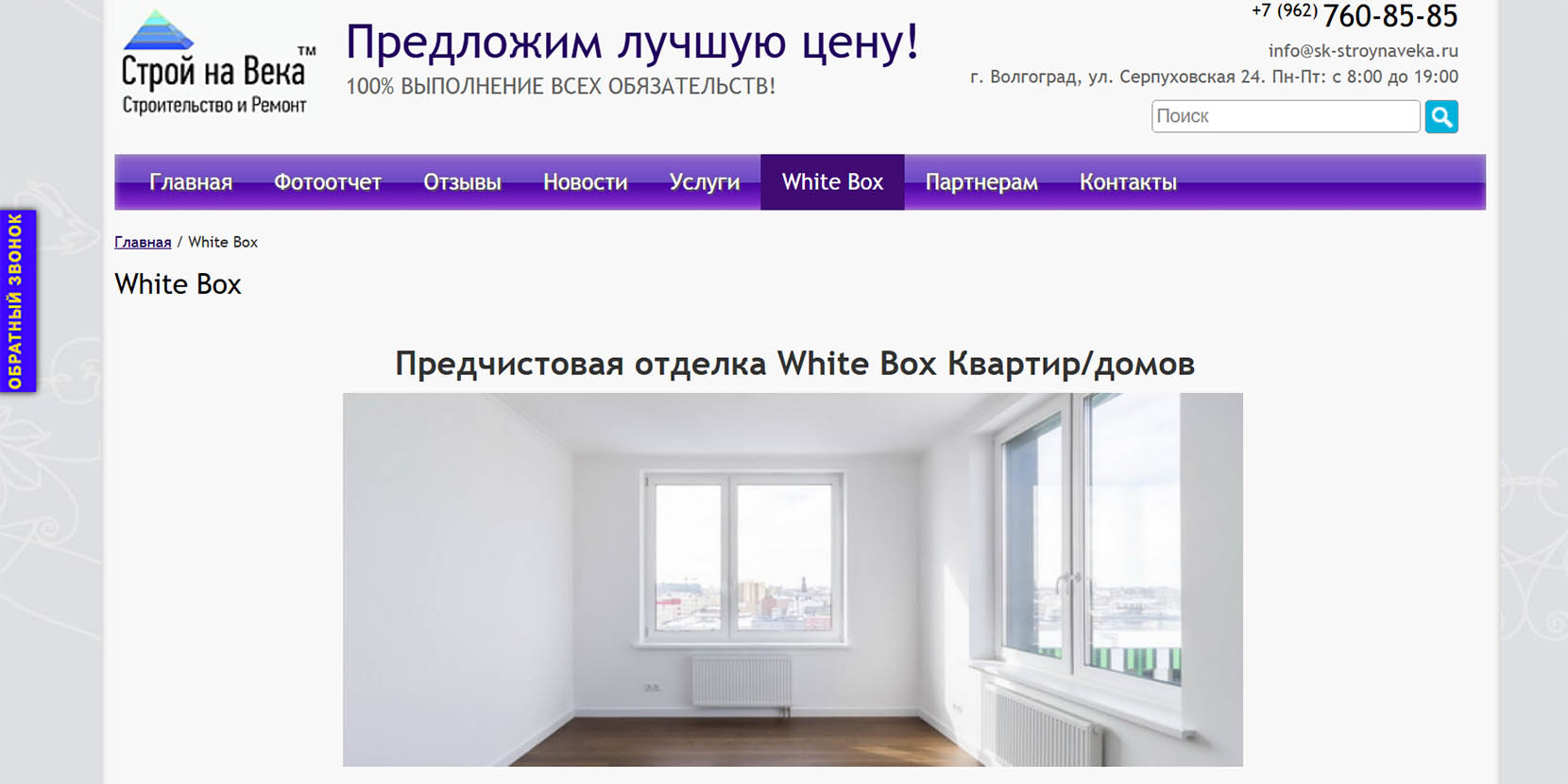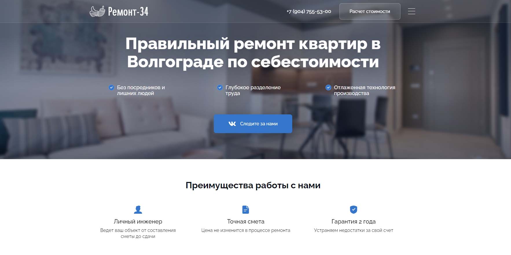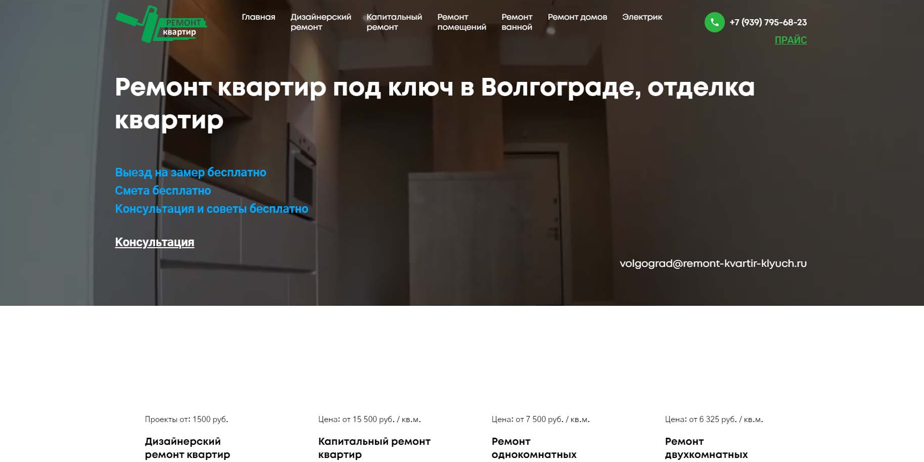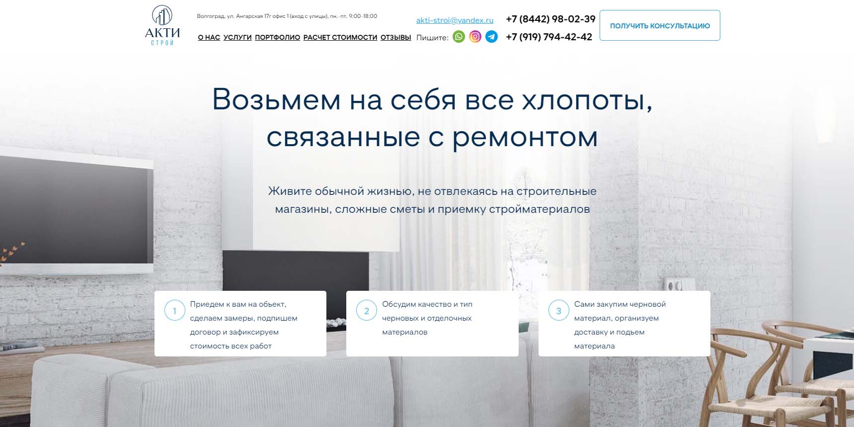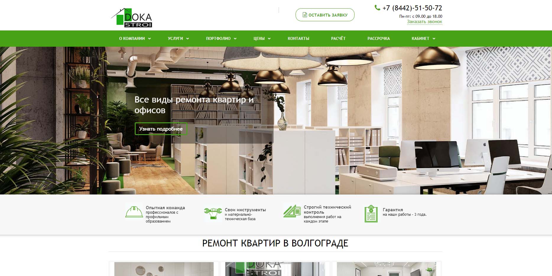Компания работает в Волгограде с 2007 года. Предоставляют полный спектр услуг по ремонту и проектированию квартир, офисов, дизайну интерьеров. Есть штат профессионалов — более 100 сотрудников, которыми уже выполнено около 1500 ремонтов квартир и более 50 ремонтов офисов. У компании есть свой инструмент и материально-техническая база, строгий технический контроль. Предоставляют гарантию на выполненные работы — 5 лет. Учитывают все нюансы: от пожеланий клиента до особенностей ремонта.