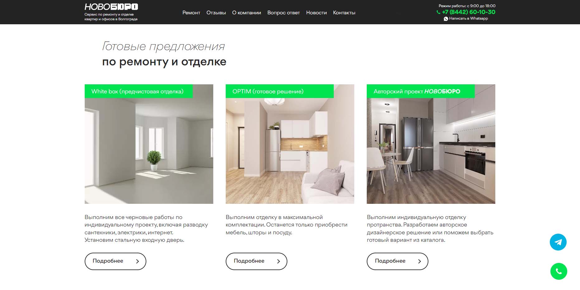Компания работает в самом Волгограде, но готова также выехать в районы. Ориентируется на бюджет заказчика и разрабатывает оптимальное предложение, исходя из установленной суммы. Клиент может приобрести материалы самостоятельно или поручить это представителям компании, которые обязательно предоставят чеки. Прозрачные условия сотрудничества, индивидуальный подход и четкая работа по ТЗ являются «тремя китами», на которых строится успех этой ремонтной организации.