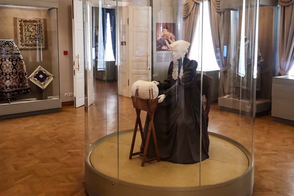 «Кружево в крестьянском костюме» — отдел музея, рассказывающий о традициях украшения кружевами повседневной одежды и этнографического текстиля. Роскошные узоры на женских костюмах поражают трудоемкостью и тончайшей работой.