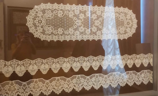 «Кружевные изделия 1920–1940 гг.» — хронологический раздел, показывающий авторские произведения кружевного промысла, сделанные талантливыми художниками объединения «Снежинка»: Викторией Ельфиной, Верой Веселовой, Капитолиной Исаковой. На стенах и в витринах выставлены красивые скатерти, занавески и портьеры.