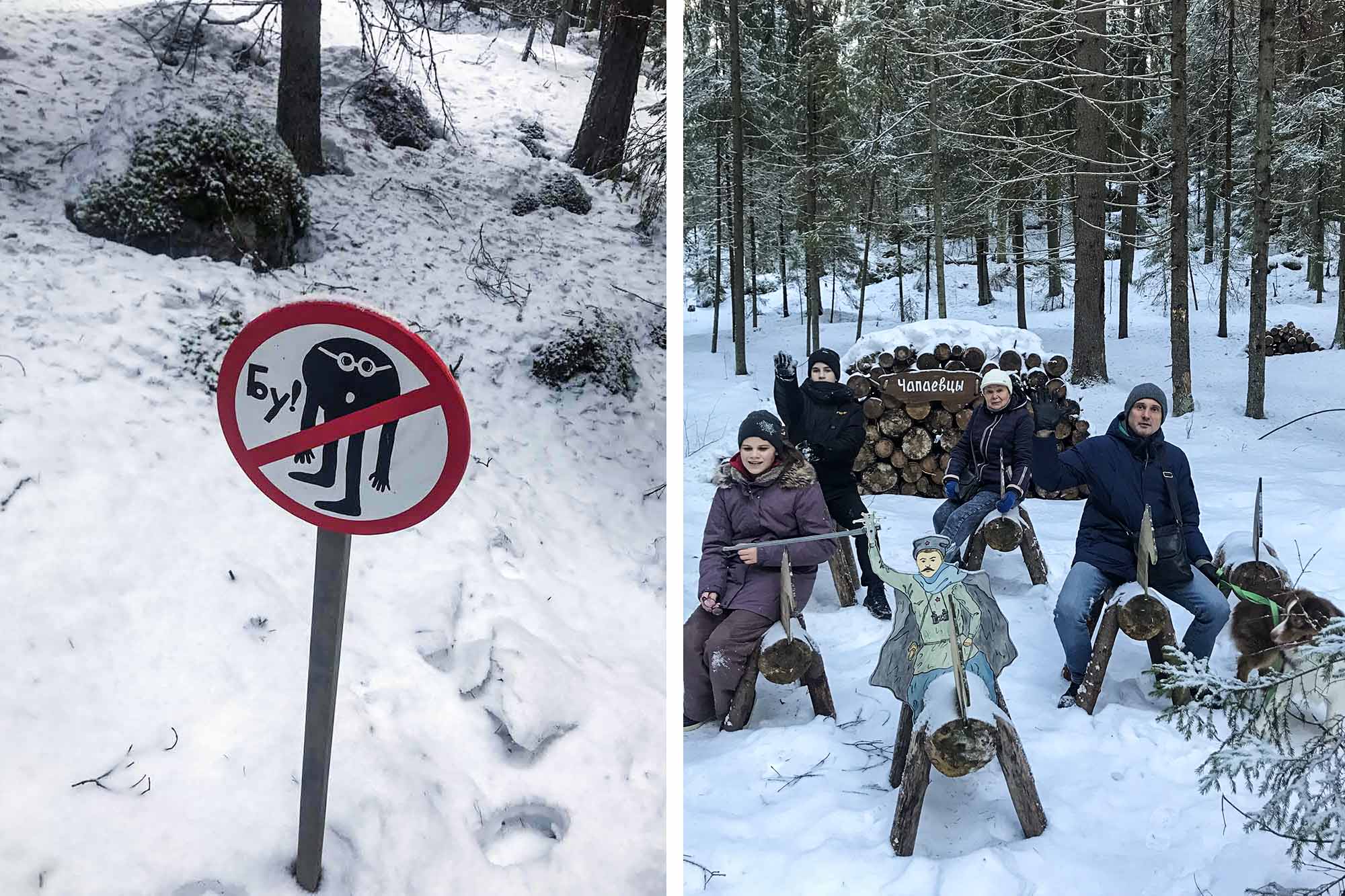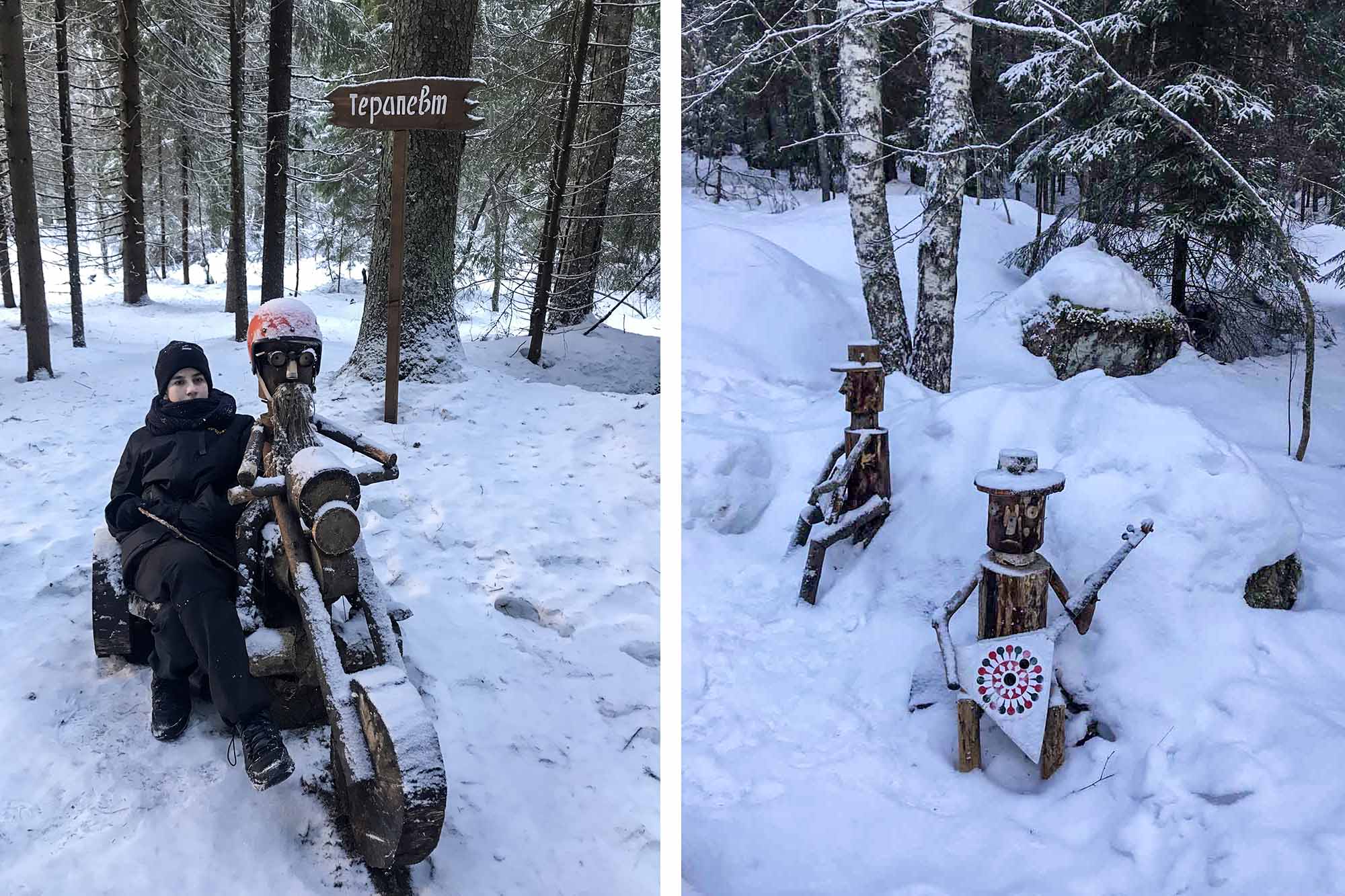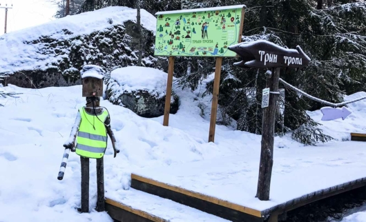 Красоты северного леса и вписанные в природные красоты инсталляции — вот что такое прогулка по «Трын-тропе». В начале путешествия ступить на деревянный настил, убегающий извилисто в чащу, туристов приглашает березовый полицейский. И такие человечки встречаются каждые несколько метров на протяжении всей «Трын-тропы». Они никак тематически с ней не связаны, они как бы сами по себе.