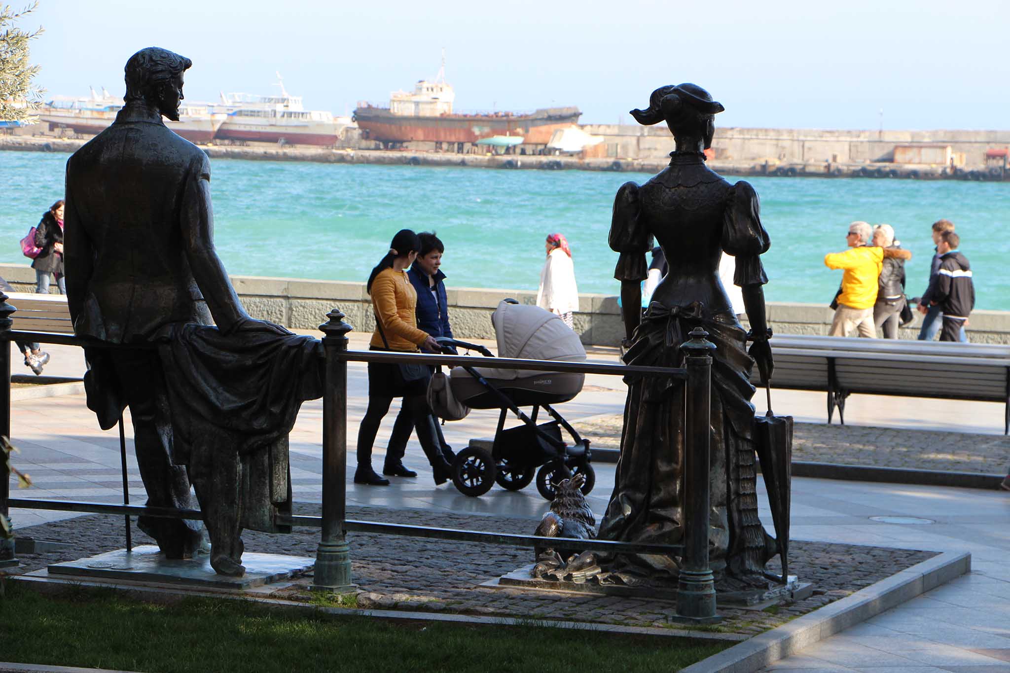 Богата ялтинская набережная и памятниками. Их тут действительно много — начиная от классических советских, вроде монументальной фигуры Ленина в самом ее начале, до необычных и забавных: памятник чеховской Даме с собачкой, Михаилу Пуговкину в образе режиссера Якина. Возле концертного зала «Юбилейный» поставлены памятники портфелю Михаила Жванецкого, трубке Александра Ширвиндта, шляпе Клары Новиковой, жилетке Аркадия Арканова и микрофону Иосифа Кобзона.