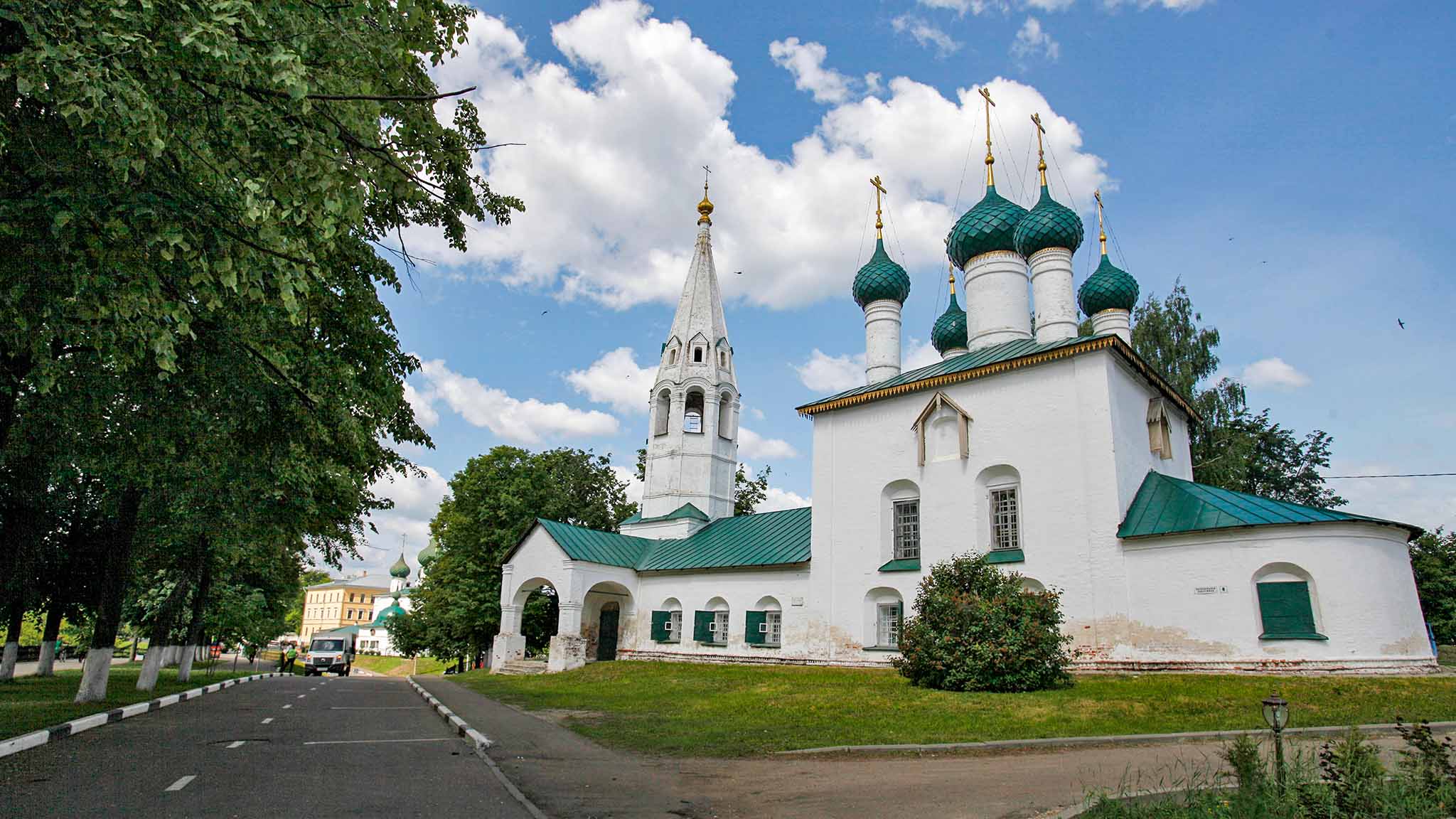 Путешествие можно начать с главной архитектурной доминанты города — бывшего Спасо-Преображенского монастыря, или «Ярославского кремля». Объекты на его территории входят в Ярославский архитектурный музей-заповедник. Там же располагается и старейшее здание города — Преображенский собор, его возвели в XVI веке. Также там вы увидите Церковь Ярославских чудотворцев, Воскресенскую и Введенскую церкви, часовню Трифона, монастырские корпуса, несколько крепостных башен.