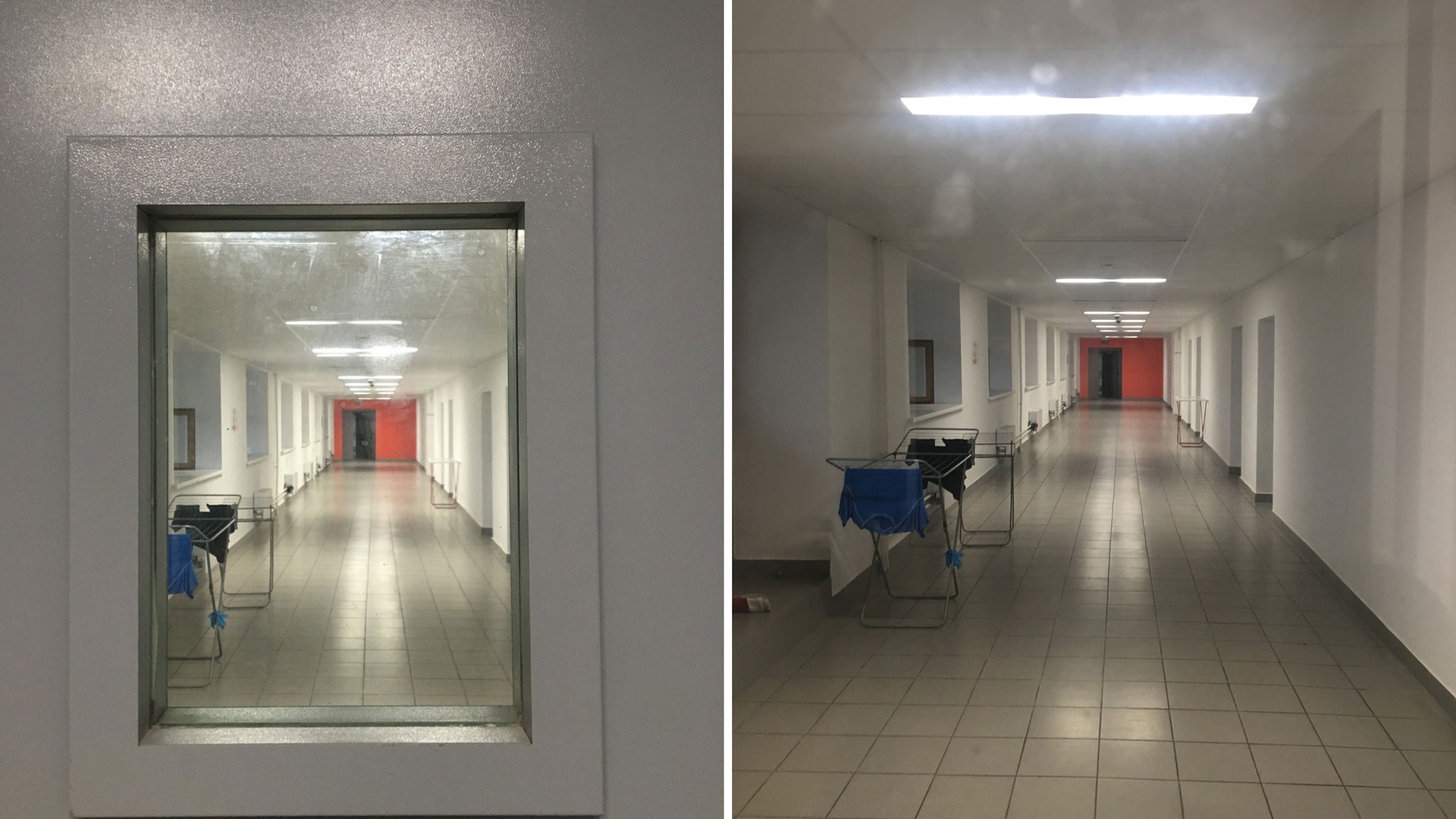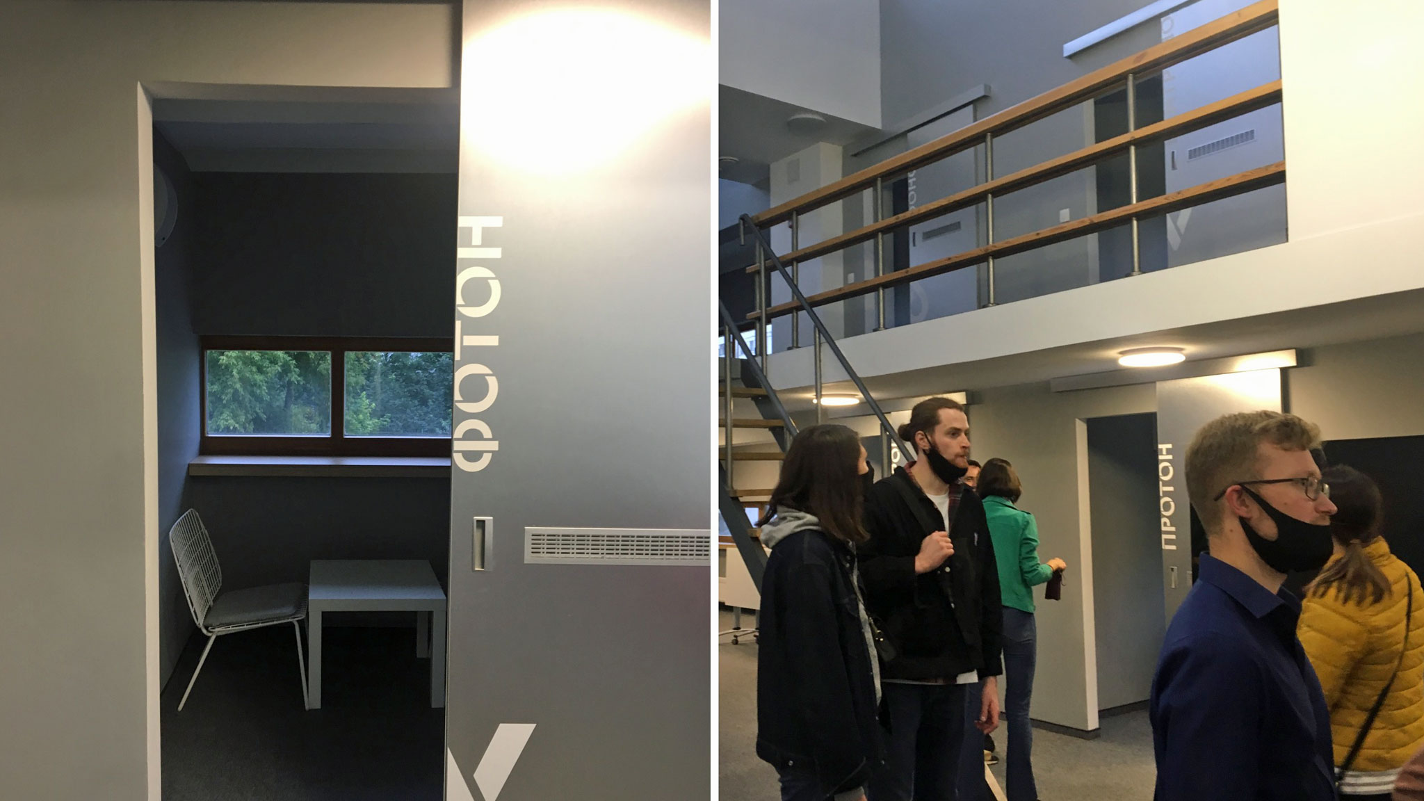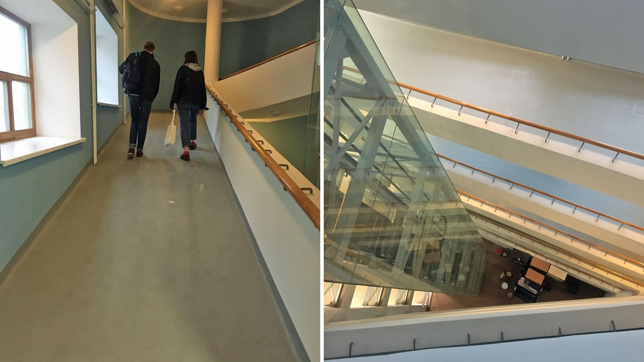По пандусам нам разрешили подниматься с этажа на этаж. Можно было глядеть в окна. А вот посмотреть, какими стали комнаты для студентов, нам не дали. Говорят, стали больше: 11 квадратных метров на одного человека, 17 — на двоих. Межкомнатные стенки удалось легко передвинуть, благодаря третьему принципу Корбюзье: свободной планировке. Заглянув в один из коридоров, я убедился, что двери в комнату не стеклянные, а обычные. Да и санузлы, по слухам, расположены не в санитарном блоке, а по одному на две комнаты.