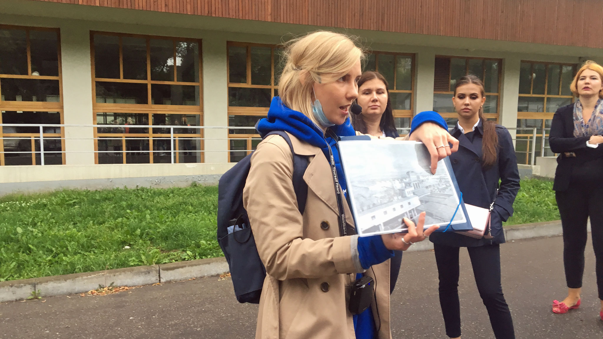 Провожатый по Дому-коммуне — историк архитектуры Ксения Григорьева. Милейшая девушка, фанатка железобетона и конструктивизма. У нее синий снуд на шее, микрофон у рта, и она уверена, что конструктивизм — это круто и его нужно спасать, потому что «это самый хрупкий пласт истории в Москве. После модернизма, конечно».